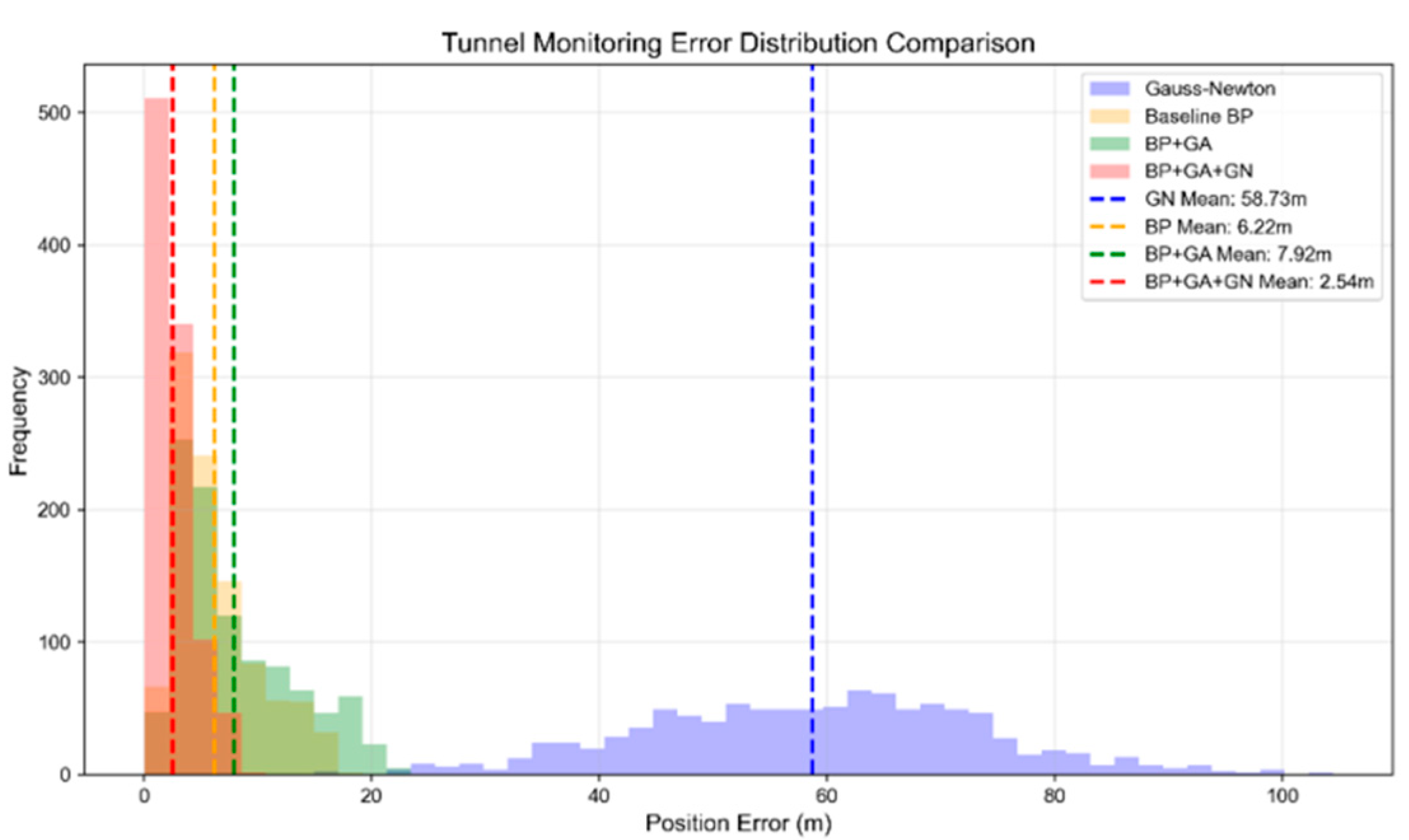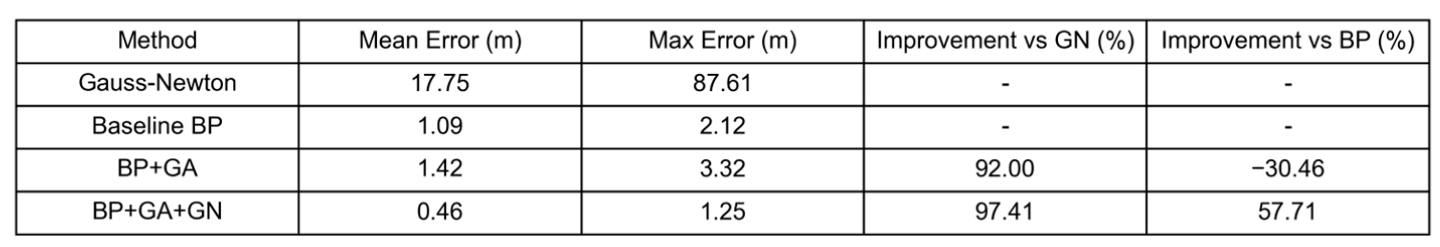 - This study proposes a BP-GA-GN hybrid microseismic localization algorithm with a closed-loop collaborative mechanism of “GA global initialization, BP data-driven fitting, GN physical constraint refinement”, which fundamentally breaks through the limitations of existing hybrid algorithms that rely on “pairwise splicing”. Specifically, GA optimizes BP’s initial parameters to avoid local optima, BP learns the nonlinear mapping between sensor time differences and source positions, and GN realizes fine convergence based on the physical model of seismic wave propagation—jointly ensuring the algorithm’s balance of global search capability and local optimization precision.