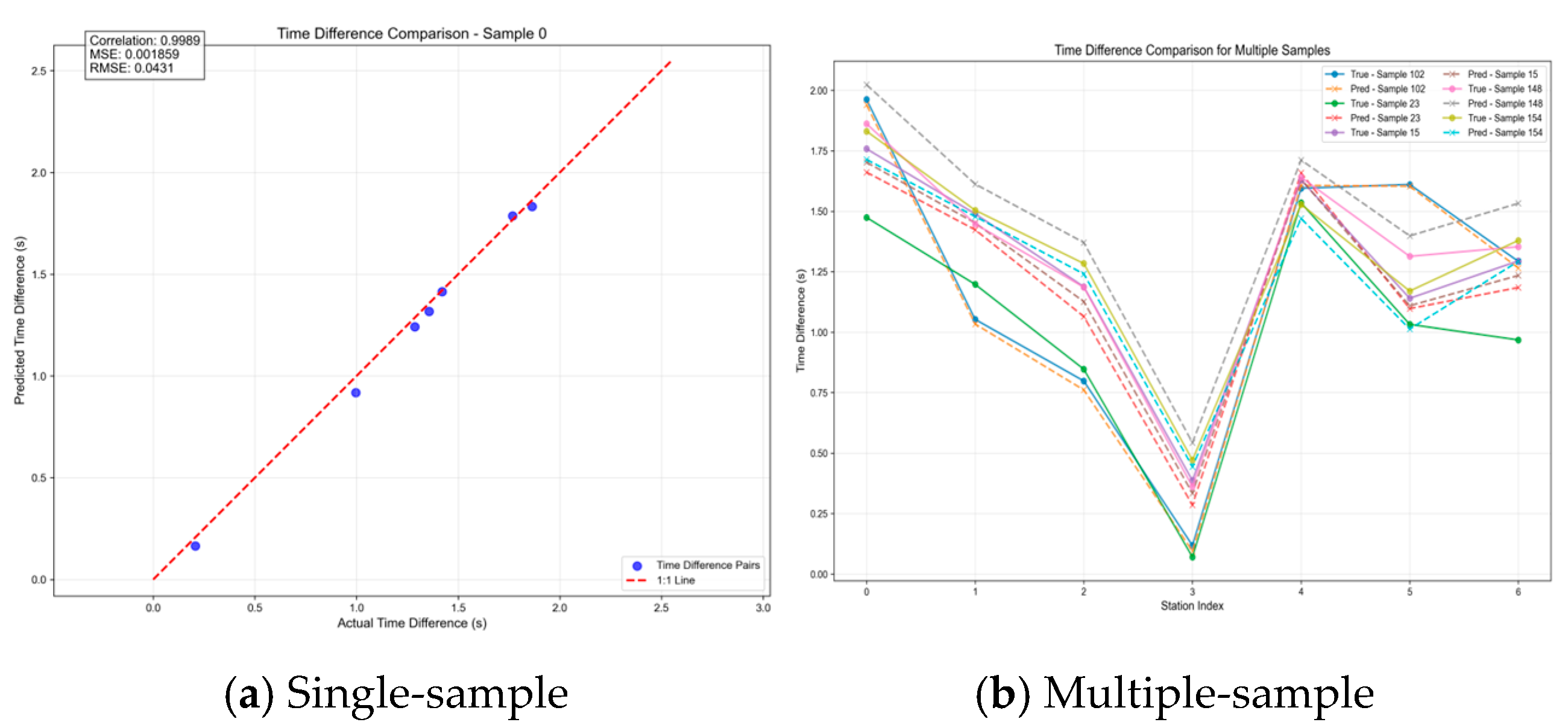 - Tests of the BP-GA-GN fusion algorithm in the actual scenarios of a complex mining area in the southwest and a tunnel in the southwest, achieving average errors of 0.42 m and 2.54 m, respectively. These results demonstrate that the BP-GA-GN algorithm maintains good localization performance under different geological conditions. In terms of sensor time difference prediction, the correlation coefficients between simulated and measured data are 0.9906 and 0.9989, respectively, with both MSE and RMSE remaining at low levels. The prediction curves show good alignment across different sample and sensor combinations, indicating strong generalization. In the future, we will compare the BP-GA-GN algorithm with common hybrid algorithms in more complex geological environments to further test its accuracy and robustness.