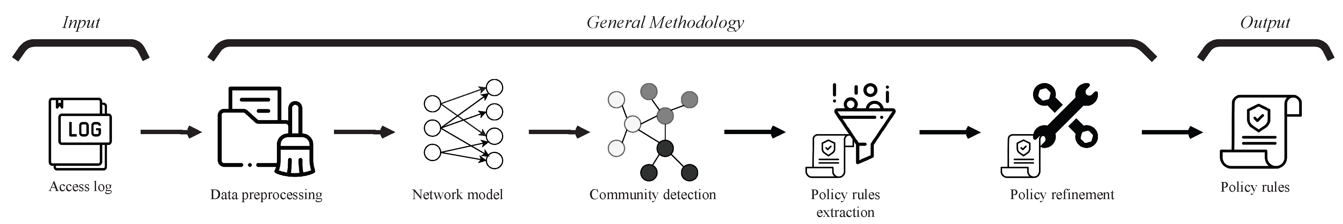 Figure 1. Our approach is divided into five phases: (1) data preprocessing, (2) network model, (3) community detection, (4) rule extraction, and (5) rule refinement. The input of the methodology is an access log