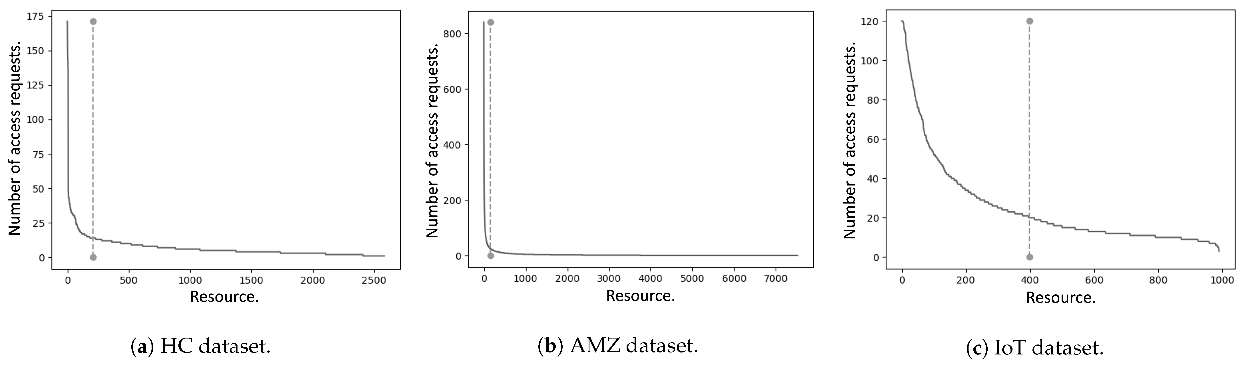 Our bipartite network model consists of positive unique access requests; therefore, we remove all duplicated access requests, i.e., the same user accessing the same resource. In the last task, we calculate the access frequency of each resource in the access log. There are many resources with few access requests. In other words, just a small number of resources could help to extract more information to build a bipartite network model. We remove all resources under a specified threshold of number of access requests .