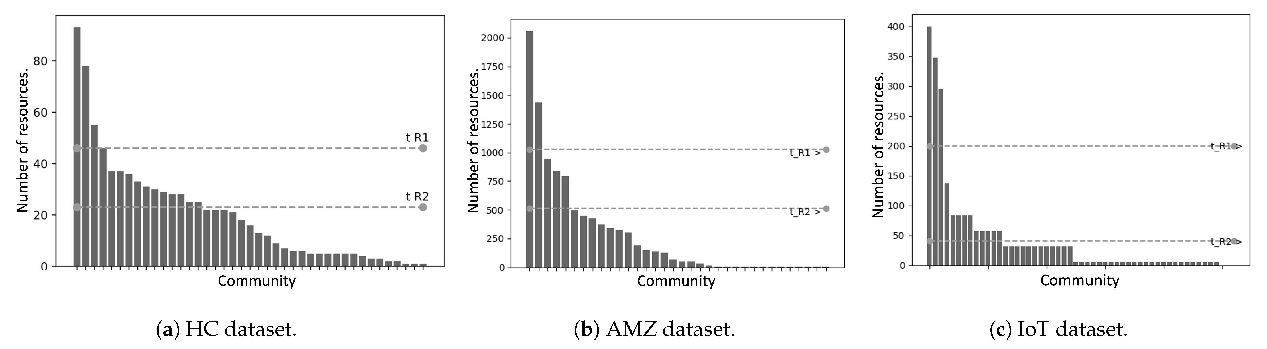 To prune less frequent resources, it is necessary to set a threshold based on the number of users accessing a resource . The threshold value can vary, but it is recommended that it be or up to for all users—for example, if there are 20 users in community C, and a threshold of is established; that is, . In this example, the resources that are accessed by two users or fewer are considered less frequent resources; therefore, they are removed from the total of resources in the community. Once the resource pruning is executed, the same process is applied as for F-type communities.