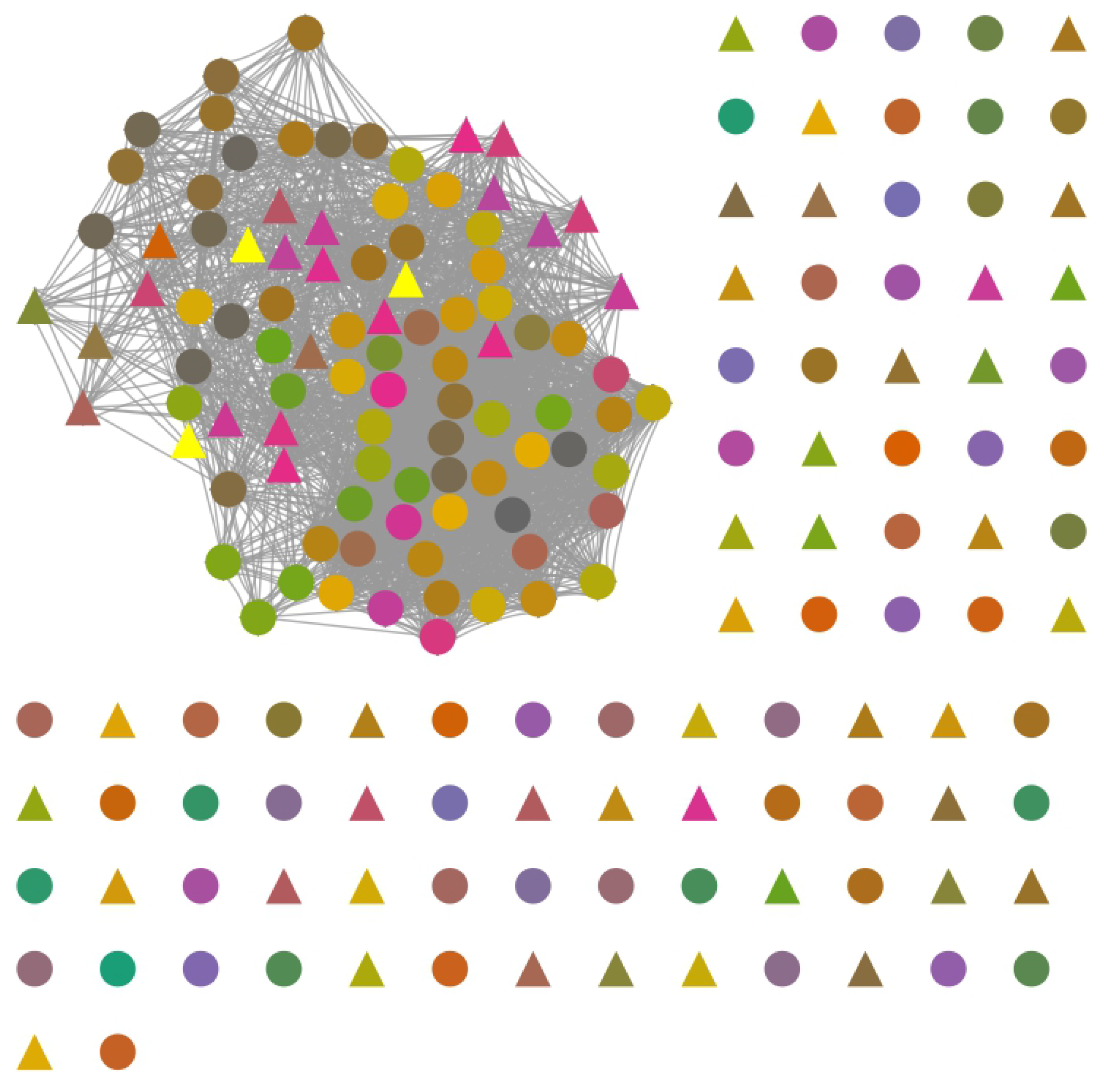 Louvain’s algorithm to detect communities iteratively executes two phases. First, each node is a new community. Next, each node joins the community of one of its neighbors which provides a higher modularity value. The above is repeated for all nodes until the modularity value does not improve with new node joins. In the second phase, all the nodes of a community are grouped, and a new network is built where the nodes are the communities of the previous phase. The time complexity of the Louvain algorithm is , where n is the number of nodes in the network. The algorithm is non-deterministic and belongs to the group of agglomerative hierarchical algorithms.