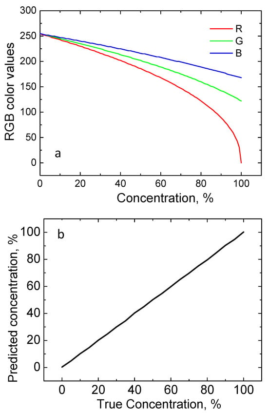 During the study, it was observed how the color of the solution changes with increasing concentration from 0 to 100%, analyzing RGB (red, green, blue) data, which allows us to draw conclusions about the color transformation and its possibilities for determining concentration (Figure 2a). The initial color of the solution at 0% concentration was almost white (R = 255, G = 255, B = 255), indicating that the material is practically transparent or light white, and, at low concentrations, the color changes are minimal. As the concentration increases, the value of the red (R) component decreases almost linearly from 255 to 0, while the green (G) and blue (B) components decrease more slowly, from 255 to 122 and 168, respectively, so the color of the solution gradually changes from light gray or white to a greenish-blue (cyan/teal) hue, and, from 50% concentration, it becomes noticeably darker, acquiring a gray-green with a blue tint, which at high concentrations (90–100%) turns into a dark greenish-blue tone, as the red component almost disappears. The decrease in the red color is the fastest and main factor determining the color shift, while the green and blue components, decreasing more slowly, maintain their respective shades even at high concentrations. These trends allow visual observation of color changes based on the ratio of RGB components without special equipment, and the consistent and almost linear color change makes it possible to use RGB data for concentration visualization, color scale, or visual indicators, allowing for quick and accurate assessment of substance concentration in laboratory studies or chemical experiments without complex measuring devices [,,,,].