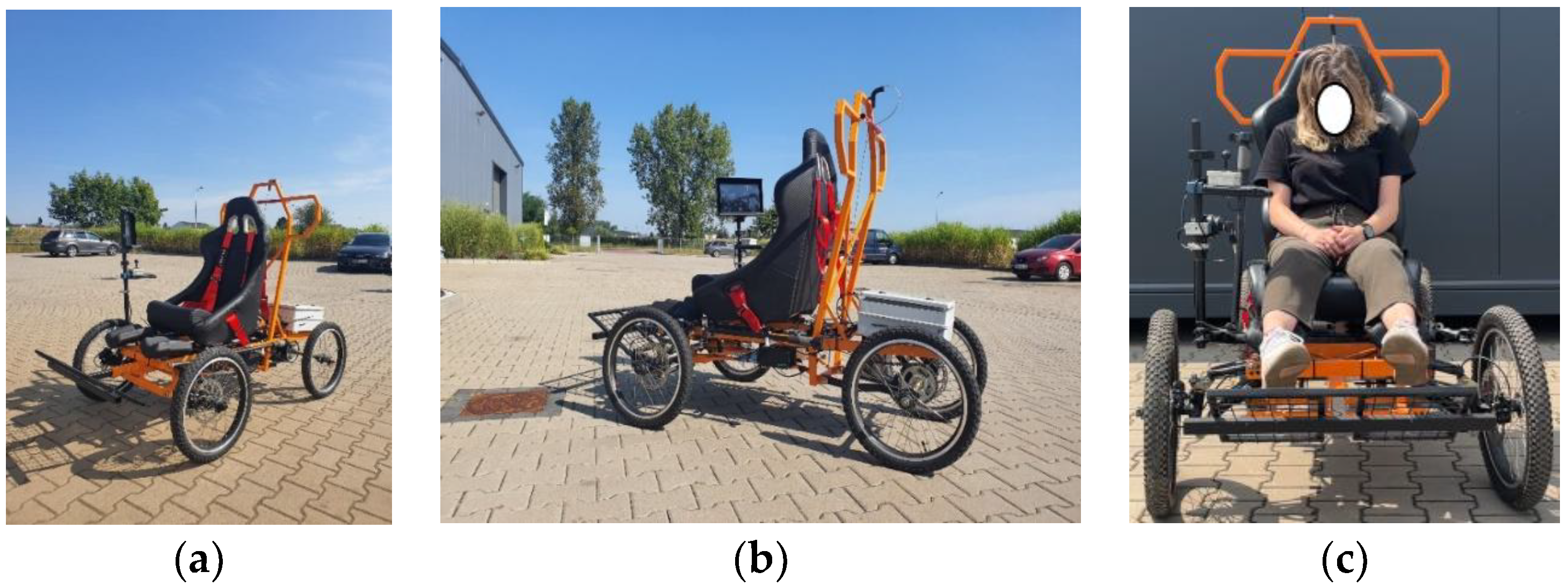 Therefore, using only this form of the PWSN vehicle control (i.e., eye steering) can be dangerous. Another issue is the separation of pupil movements from involuntary movements or those related to observing the traffic scene (more broadly) in natural environment, since this is precisely the reason why mountain trails are used, after all. Consequently, the said procedures have been modified by introducing additional information and a system of two cameras or a face camera, where both eyes are monitored (mounted on a GoPro-type support). Movement to the left is achieved by closing the right eye (as a precaution when changing direction), depending on the current blinking characteristics measured on an ongoing basis, for a specific period of time, followed by briefly glancing in the direction of movement or—with the vehicle’s situational camera in use—turning the head slightly to the left. To turn in the other direction (right), one closes the left eye and, if possible, performs a short head motion to the left. Forward movement is commanded by moving the eyes upwards, possibly accompanied by a head movement or with a specific eye closed (this being a matter of configuration of the file containing settings for the adopted mode of control). When steering the vehicle, one should keep the eyes in a given position for longer. The health condition context of this approach has not been studied, but according to the literature, intensive activity in terms of mobility and visual acuity should also promote the rehabilitation of the sight organ. This is an additional benefit arising from this solution. Slowing the vehicle down adequately involves moving the eyes downwards, with the head moving downwards as well, if possible, and with one eye closed. To separate these signals from the motions performed in relation to nature observation, an additional gesture can be made, e.g., the free hand raised upwards, communicating such an intent in the field of view of the situational camera. The choice of the decision-making hand is determined by the functionality of the driver’s dominant hand and the corresponding way the movement manipulator has been installed on the left or right side of the PWSN vehicle (