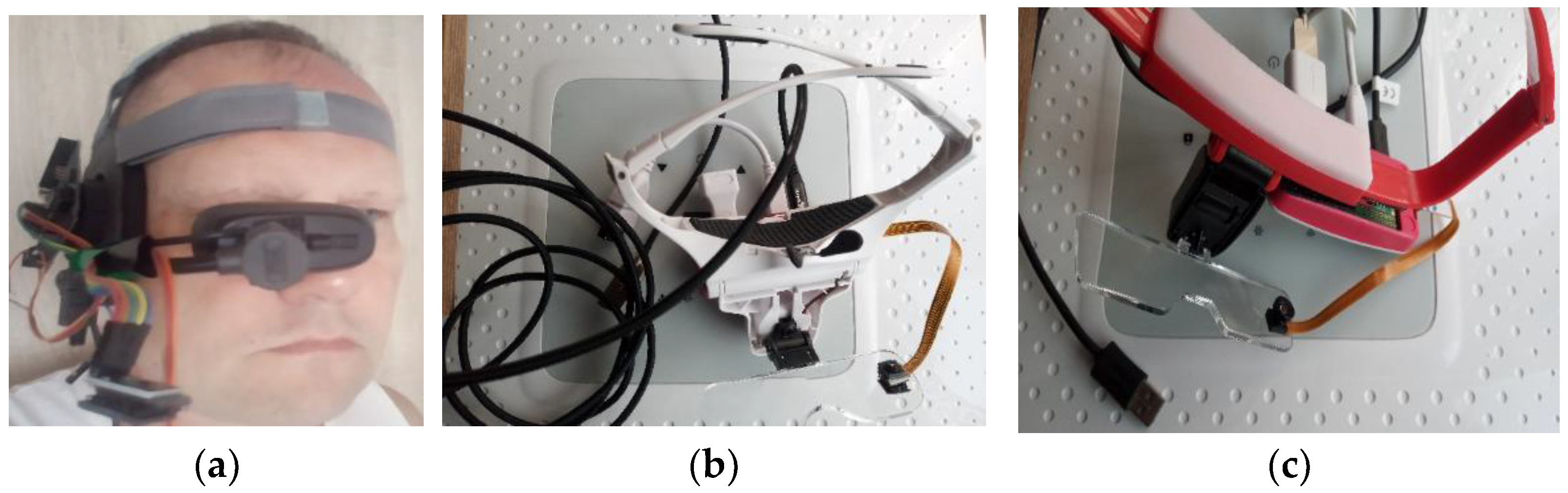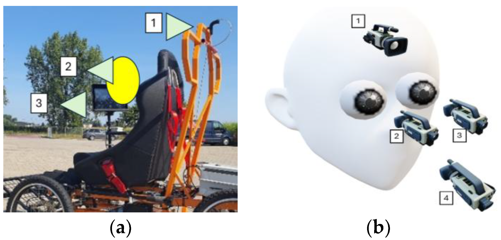 Figure 9a,b. It is a device which features synchronised cameras: one for the traffic scene, focused on the area in front of the PWSN vehicle, and one for monitoring the driver’s eye movement. It is through the integration of such sub-systems that one can create a prototype with functionality like that of the typical commercially available ETs. The work pertaining to this problem is still ongoing. The dual-camera systems were controlled from a single computer with a common time base, set using a tool of appropriate accuracy (requiring synchronisation with the GPS control unit), and synchronised by frame [