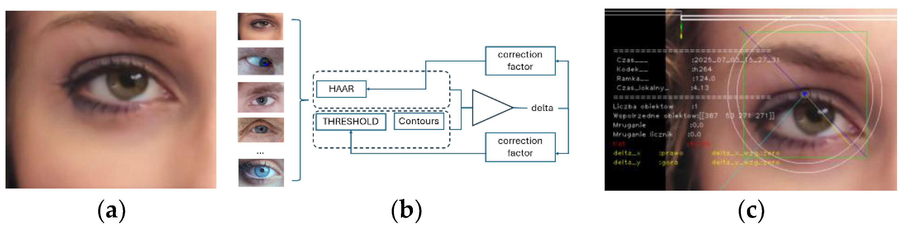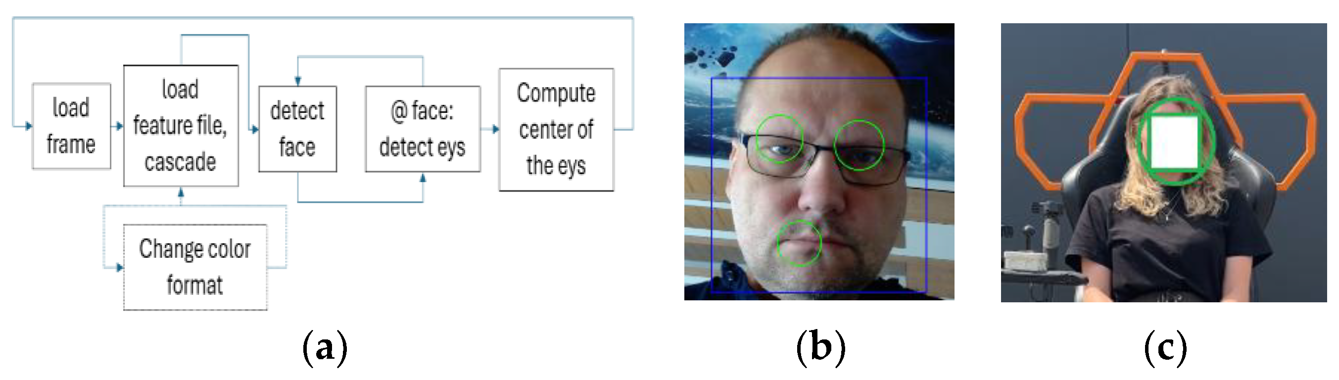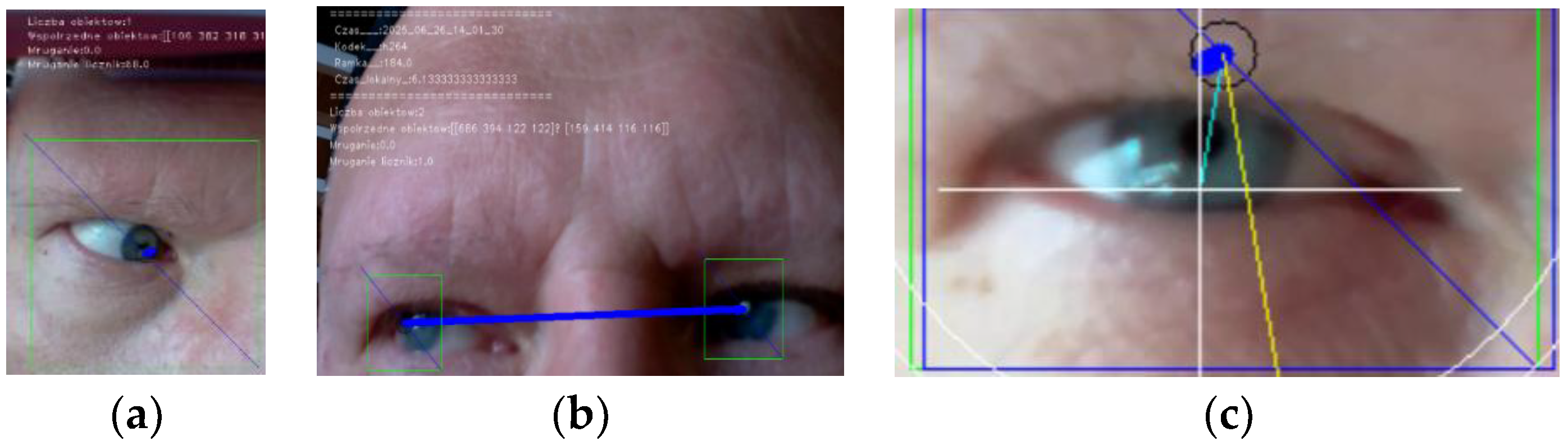 The eye position analysis programme comprises two procedures. One is based on Haar-like features, i.e., it finds the position of the eyes based on the information collected. This is possible owing to standard OpenCV library procedures. The Haar procedure enables face detection using Haar cascades, as they are commonly referred to. They provide an effective way of detecting faces, although they are relatively inaccurate (but fast). The algorithm functions by comparing the image with pre-defined features. The input data for the detection procedure are contained in XML files of the haarcascades.xml type. They determine the accuracy of the procedure. OpenCV and other providers supply ready-to-use files which can serve various purposes, including recognition of selected features. According to the procedure in question, these features are grouped in what are known as cascades, and they are compared in steps. In the first step, only a few of the most important features are checked. If there is a match, the procedure checks the next group, i.e., the cascade which is quantitatively larger, then the subsequent one, and so on, hence the high processing rate. If the comparisons of all the features are correct, what follows is identification, which is provided in the form of a rectangular area where the object subject to recognition has been identified. This procedure is also used to recognise road signage when a cycle for PWSN is used to navigate the road network.