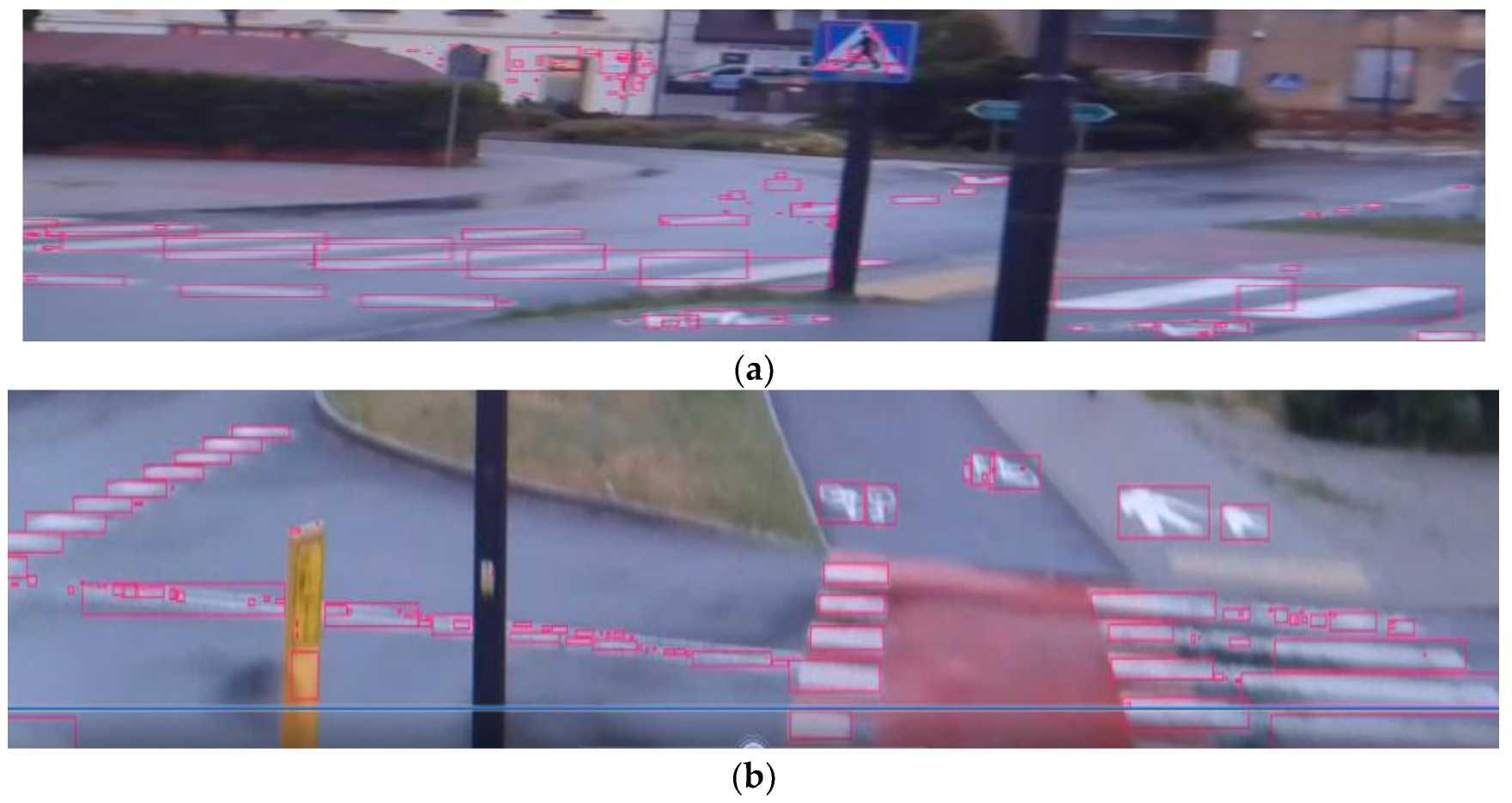 21]. An improved object detection algorithm intended for AVs was applied in their study. The average perception accuracy for individual TS elements reached 75%. Using the image fusion method, drivers’ points of view were combined with vehicle monitoring screens. This cooperative perception was able to cover the whole risk zone and predict the trajectory of a potential collision [