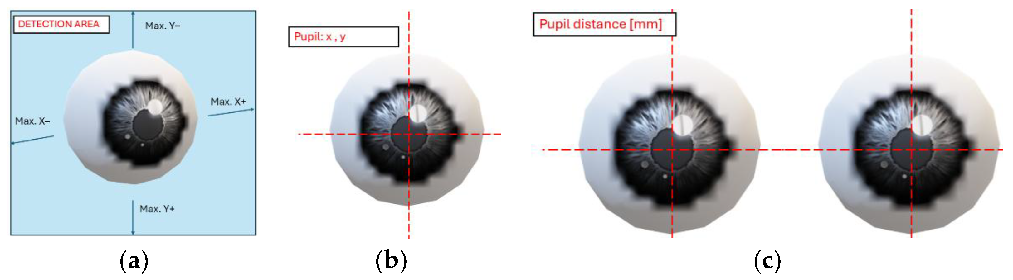 Every human eye is only similar. This problem is addressed by biometrics. However, we are only interested in the measures of eye position, which also pose certain issues when being determined. The eye position measurement can be affected by various anatomical features, such as eye folds, individual characteristics (congenital and acquired diseases), or even illumination, humidity of the environment, etc. This is the reason why we have been consistently building our own database of eye representations, matching diverse environmental conditions and aligned with the diagram provided in
