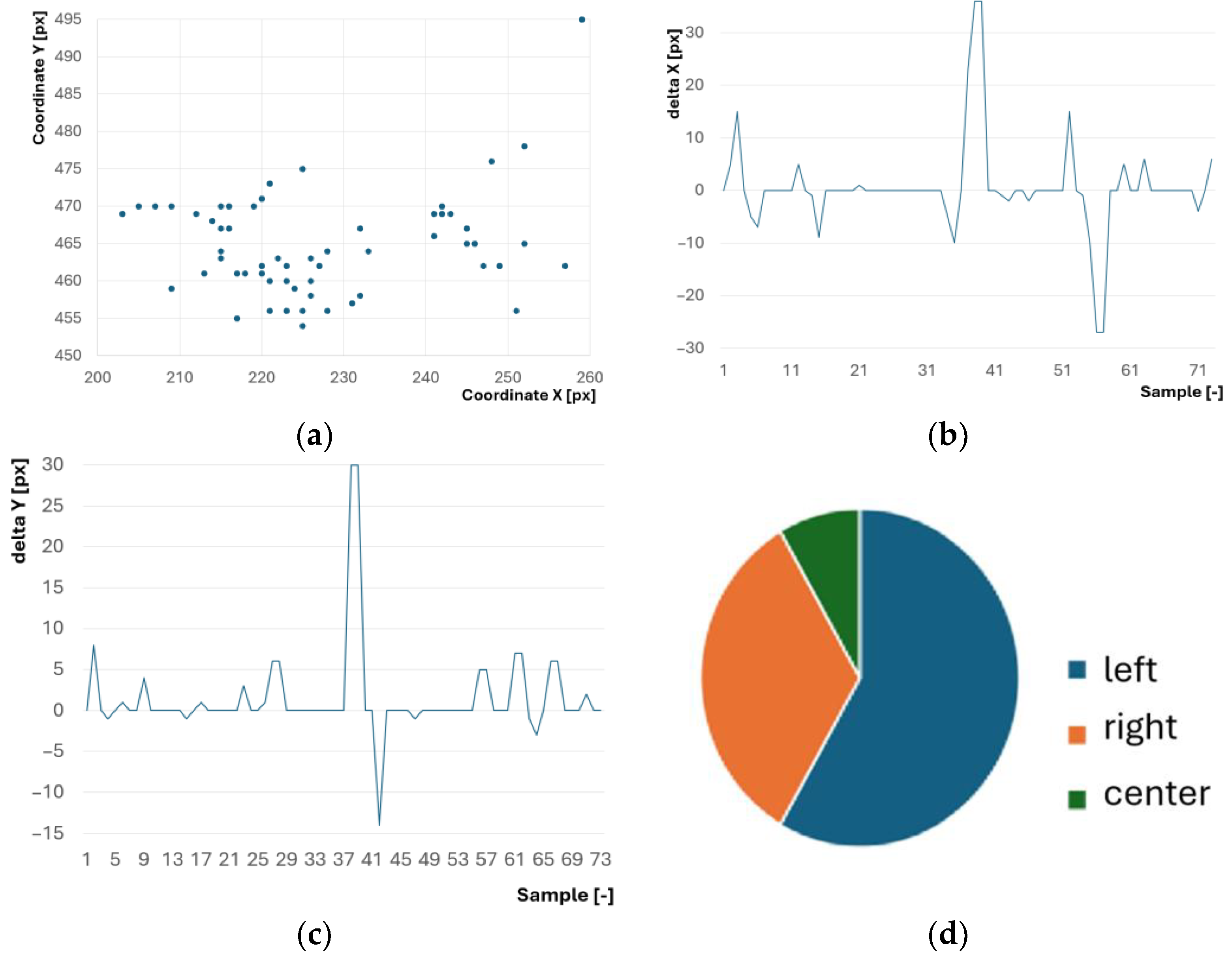 Figure 16d indicates how complex it is to obtain information about the movement direction based on data retrieved from the driver’s sight. Such studies, apart from providing the possibility of applying their results to control the turning behaviour of a vehicle, also often show which eye is dominant. However, these characteristics were not used to analyse the upward and downward deviation of the pupil (as shown in