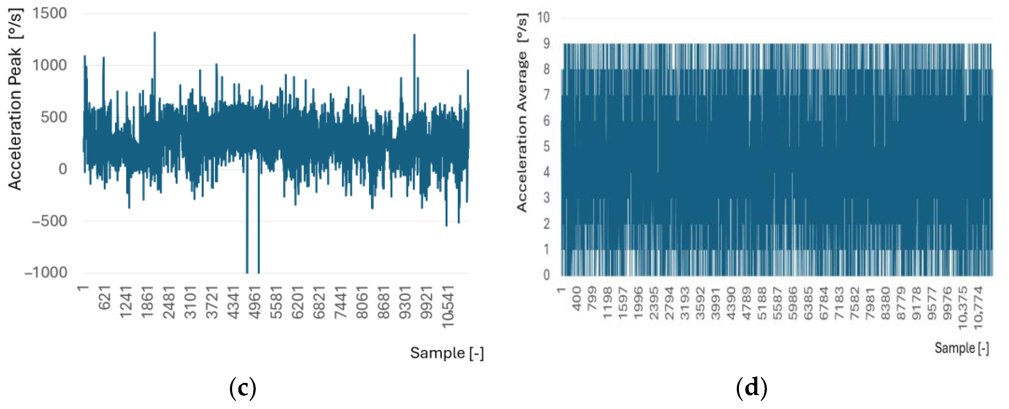 Figure 21c,d show the acceleration peaks and average acceleration, respectively. There is a certain regularity observed in the average acceleration values, which cannot be said about peak acceleration values. These driver vision characteristics demonstrate how difficult it is to make sure that the values retrieved from the organ of vision are adequately limited in order to steer the vehicle effectively. While imposing such limitations, one must take numerous elements into account, including the cross-section of the infrastructure where the vehicle is currently moving and the real-life ranges of eye movement in the context of these data. We believe that engineering a safe vehicle control system based on the organ of vision will render tourism, including mountain tourism, available to people who are currently denied such an opportunity. However, this type of a vehicle control model requires a separate publication to present and discuss it in a detailed manner.