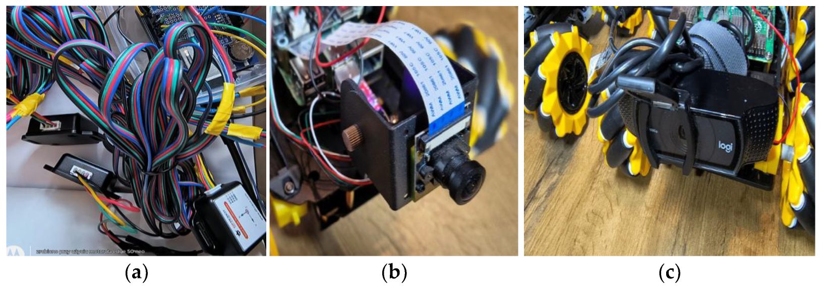 Figure 20b) is compatible with the Raspberry Pi 4B, Raspberry Pi Zero, and Jetson Nano microcomputers, although it can also be connected to other development boards. A unit from the same company, General Driver Board (Waveshare), was chosen for the controller. It is a multifunctional controller designed for the control of mobile robots, and it is based on the ESP32-WROOM-32, Espressif Systems, Shanghai, China module. This board cooperates with the following platforms: Raspberry Pi and Jetson Nano (Raspberry Pi 4B was used in the validation process). A device known as a general-purpose controller makes it possible to control DC motors both with and without encoders (in this case, the distances covered were established in a different manner). The board features standard terminals for connecting numerous typical robot components and accessories. These can be OLED displays, sensors, WiFi antennas, and sub-assemblies for environment scanning, e.g., Lidar. The device used under the research project in question was a Lidar from the same company, Waveshare, Shenzhen, China., namely D200 Developer Kit–LiDAR LD14P, offering 360-degree scanning and up to 8 m of operating range [
