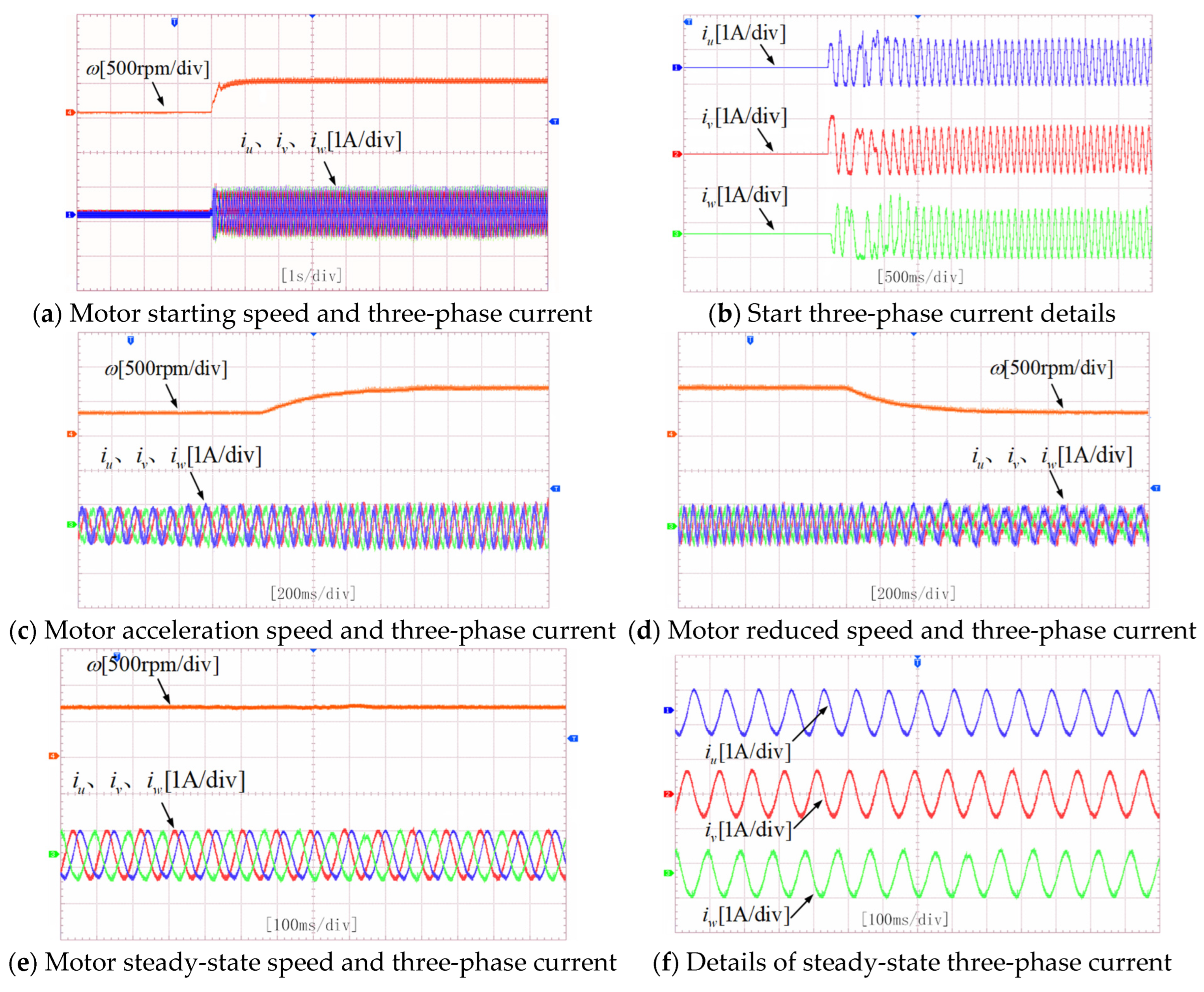 - Speed Regulation Test: To evaluate the speed control capability, the initial reference speed of the open-winding motor was set to 500 r/min with an initial load of 2 N·m. After motor startup, the reference speed was increased to 800 r/min to test the acceleration performance of the system. The reference speed was then returned to 500 r/min to examine the deceleration performance. Variations in key parameters were observed throughout the speed regulation process. The experimental results are shown in Figure 10.