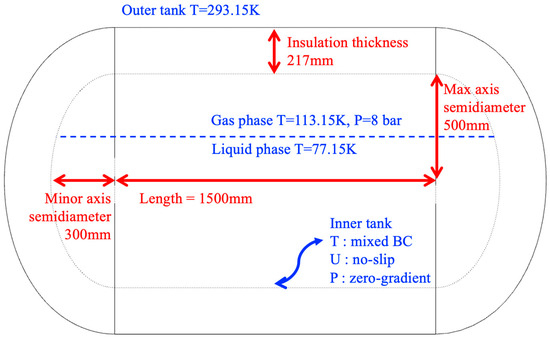 Geometric configuration, dimensions, and boundary conditions of the vLCO2 tank.