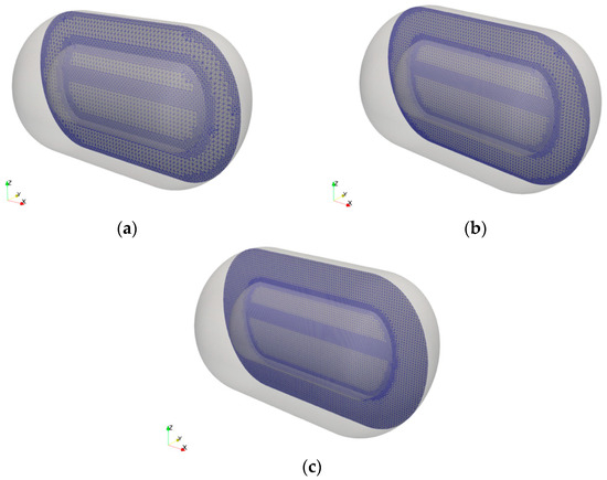 Three levels of mesh resolution used for the validation: (a) coarse mesh; (b) medium mesh; (c) fine mesh.