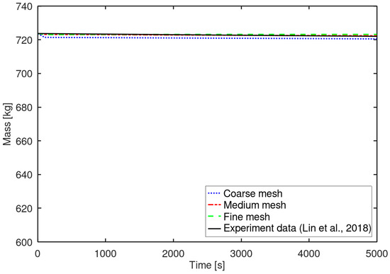 Figure 4 presents the variation in BOG generation with different mesh resolutions. BOG () was defined as the product of the liquid density and the volume of evaporated liquid over time. BOG indicates the cumulative evaporated mass and is expressed as follows: