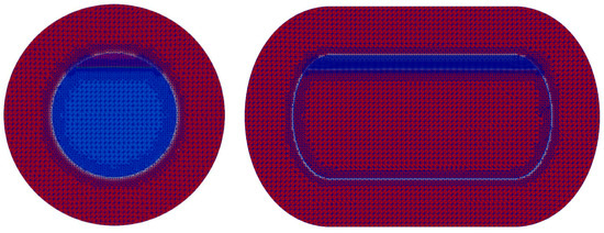 Figure 6 illustrates the initial filling condition of LCO2 inside the tank. An initial filling ratio of 94.5% was adopted. A locally refined mesh was generated near the liquid–gas interface to accurately capture interfacial phenomena. The initial conditions specified a temperature of 234.25 K for the gaseous carbon dioxide, 227.05 K for the LCO2, and an initial internal pressure of 7.8 bar. The time step was chosen such that the Courant number () remained below 1 throughout the computation to ensure numerical stability.