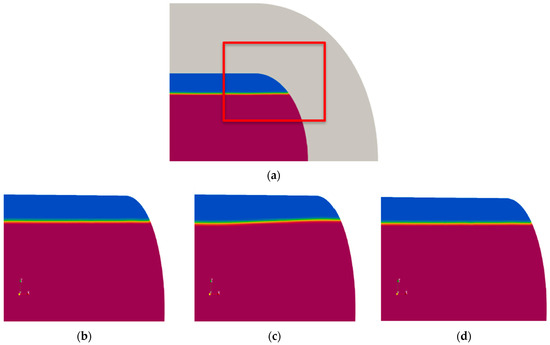 A mesh-convergence test was conducted to evaluate the influence of mesh resolution on phase change behavior. Figure 2 illustrates the configurations of the coarse, medium, and fine meshes used in this test, consisting of approximately 200,000, 400,000, and 600,000 grid points, respectively. A locally refined mesh was applied near the gas–liquid interface (free surface) in all cases to ensure numerical stability and accuracy in simulating phase change phenomena. The simulations were executed on a 70-core Intel® Xeon® Platinum 8558 CPU (4.0 GHz). The total computational time ranged from approximately 2 to 10 days, depending on the mesh resolution. The time step was dynamically adjusted during the computations to ensure the Courant number (Co) remained below 1. This approach secured numerical stability while enabling precise capture of the transient phase change
