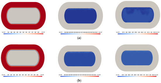 Temperature contours inside the LCO2 tank: (a) = 100 s ((left): insulation; (center): inner tank with perfect gas EOS [39]; (right): inner tank with PR-EOS [40]); (b) = 5000 s ((left): insulation; (center): inner tank with perfect gas EOS [39]; (right): inner tank with PR-EOS [40]).