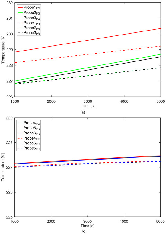 The temporal variation in temperature inside the tank was analyzed to investigate the heat transfer characteristics of both phases. Figure 11 shows the probe locations used for temperature measurements in the liquid and gas regions. For the liquid phase, three probe points (Probe4(0, 0, 0.35), Probe5(−0.4, 0, 0.0), Probe6(−0.8, 0, −0.35)) were positioned linearly between the center of the initial liquid–gas interface and the inner tank wall. Similarly, for the gas phase, three probe points (Probe1(−0.8, 0, 0.48), Probe2(−0.4, 0, 0.44), Probe3(0, 0, 0.40)) were arranged linearly between the inner tank wall and the region immediately below the interface. Figure 12 presents the temperature distributions recorded at each probe location. The temperature profiles exhibited an approximately linear distribution in both the liquid and gas phases. Temperatures were generally higher near the wall than at interior locations. The temperature by PR-EOS differs from that by perfect gas EOS because it accounts for real gas behavior. The PR-EOS, which incorporates compressibility, influenced the temperature [27]. As the distance from the wall increased, the temperature decreased while maintaining a nearly constant spatial gradient. The temperature variations observed at different probe locations within the tank showed the same trend as those reported for the hydrogen tank [42].