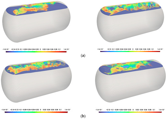 The heat ingression and evaporation inside the tank induce natural convection. In particular, the gas phase, having a lower density than the liquid phase, exhibits stronger convective motion, making convection the dominant transport mechanism. To visualize this behavior, streamlines in the gas phase were visualized based on the local velocity field. Figure 13 presents the streamlines, with the color distribution indicating the magnitude of the velocity. Flow is observed to rise near the tank wall and descend near the center. When heat conducted from the exterior wall is transferred to CO2 near the inner tank wall, local superheating occurs. This results in an increase in vaporization due to the external heat influx.