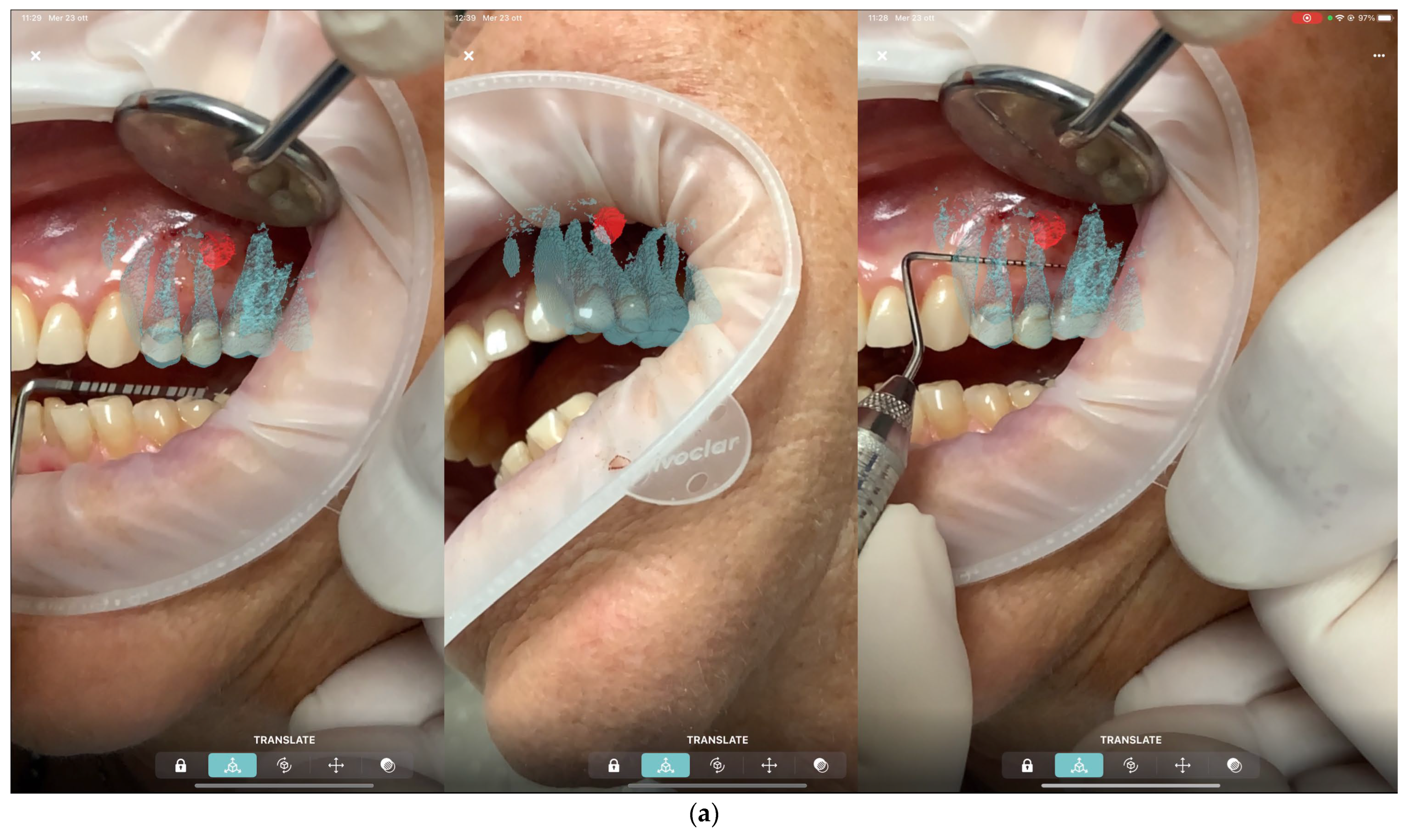 - Pellegrino, G.; Mangano, C.; Mangano, R.; Ferri, A.; Taraschi, V.; Marchetti, C. Augmented reality for dental implantology: A pilot clinical report of two cases. BMC Oral. Health 2019, 19, 158. [Google Scholar] [CrossRef] [PubMed]