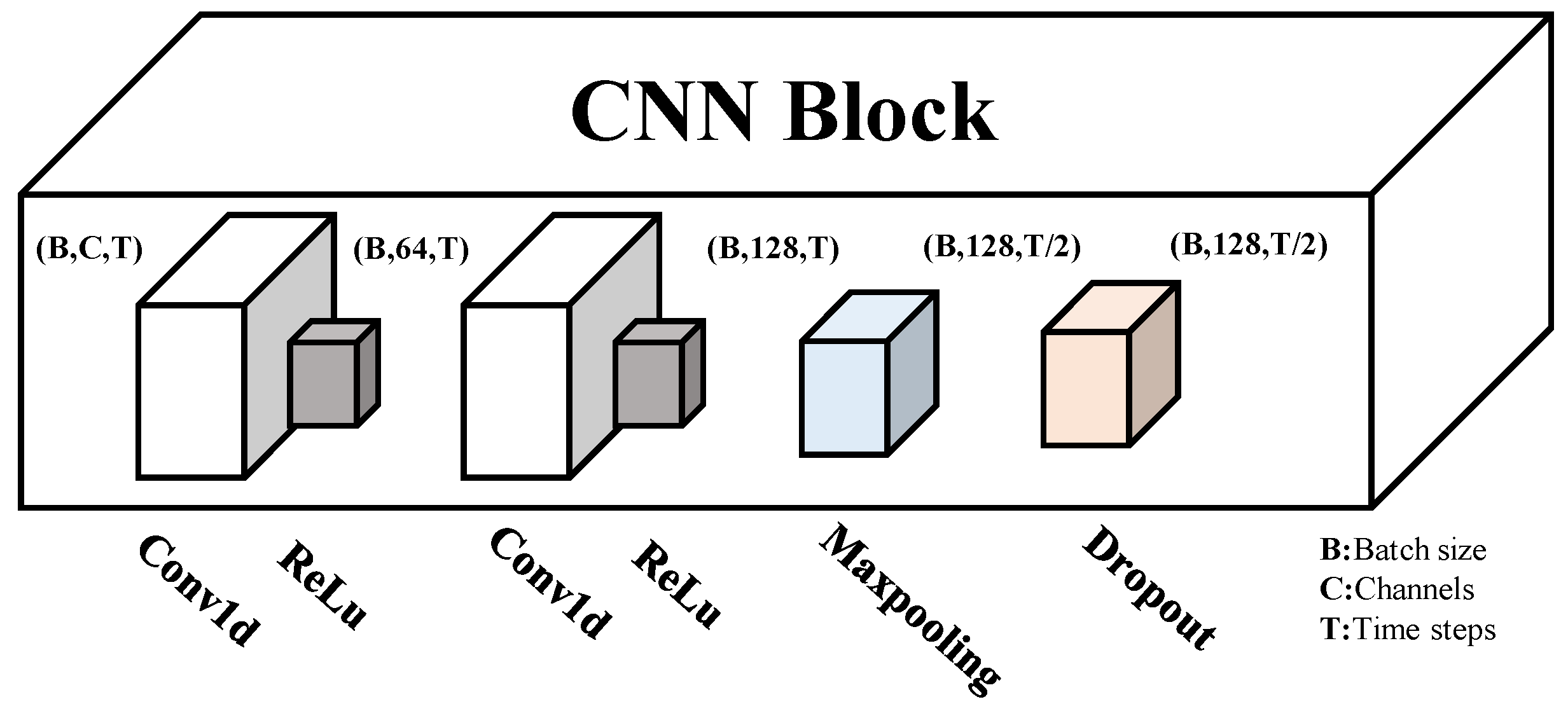 35]. The proposed model incorporates one-dimensional convolutional layers with three kernel sizes (3, 5, and 7), enabling it to capture features at multiple scales. The CNN block architecture used in this paper is shown in