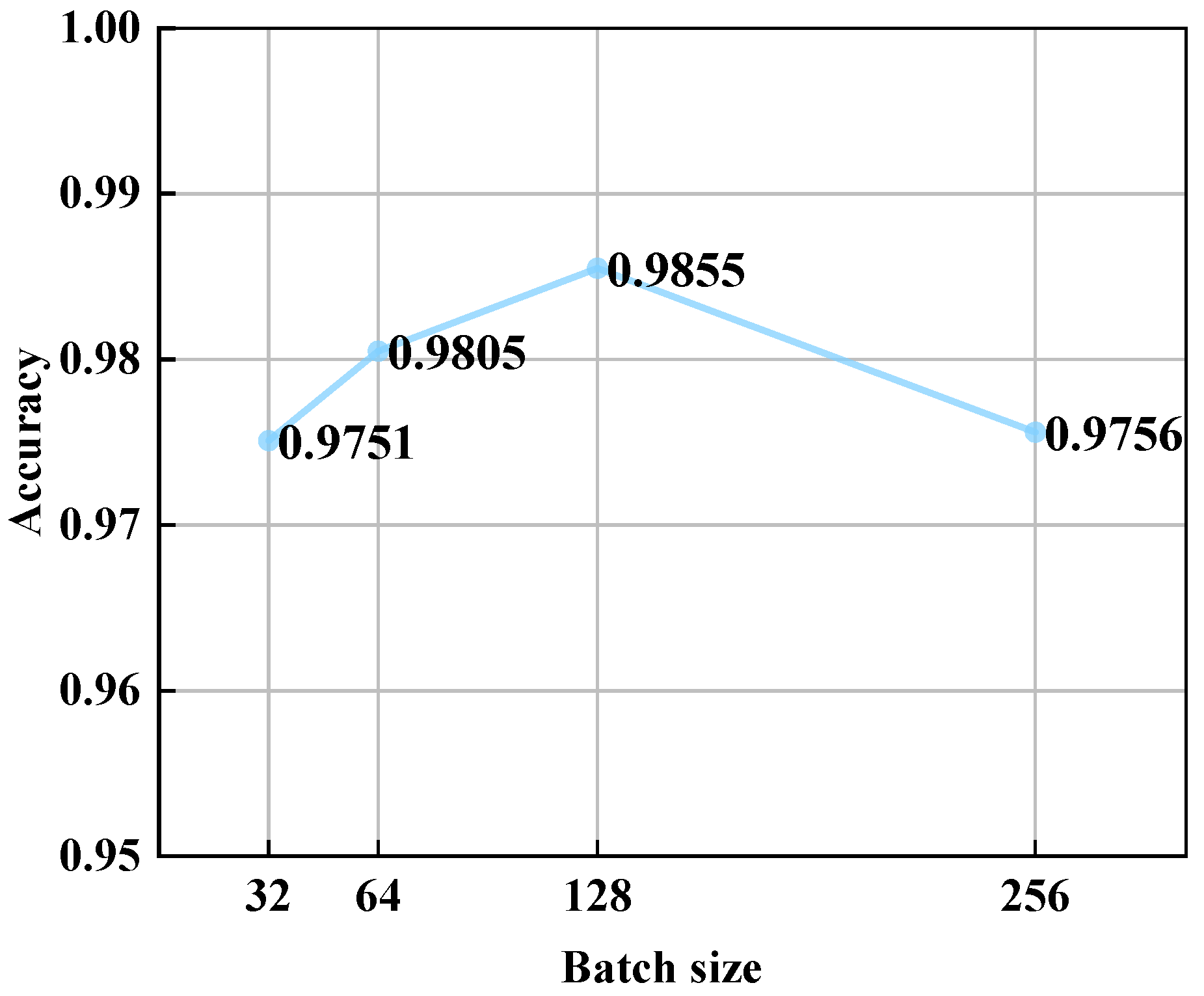 The batch size determines the amount of data used for each model update. A smaller batch size may lead to unstable updates, whereas a larger batch size can slow down convergence and increase training difficulty. To identify the optimal batch size for the model, evaluations were conducted using different settings (32, 64, 128, and 256). The evaluation results are presented in
