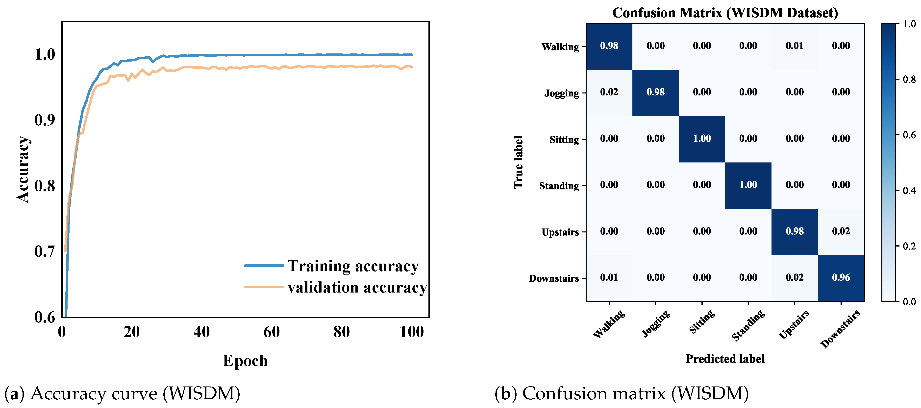 Experiments on three benchmark datasets demonstrate the effectiveness of the proposed approach. The CNN–BiGRU–Transformer model achieves recognition accuracies of 98.41% on WISDM, 95.62% on PAMAP2, and 96.74% on UCI-HAR. Compared with traditional machine learning methods, it substantially reduces the need for manual feature engineering by automatically learning discriminative representations from raw data. In comparison with existing deep learning models, it provides competitive or superior accuracy while maintaining a relatively small number of trainable parameters, moderate FLOPs, and millisecond-level inference times per sample on a PC-grade GPU.