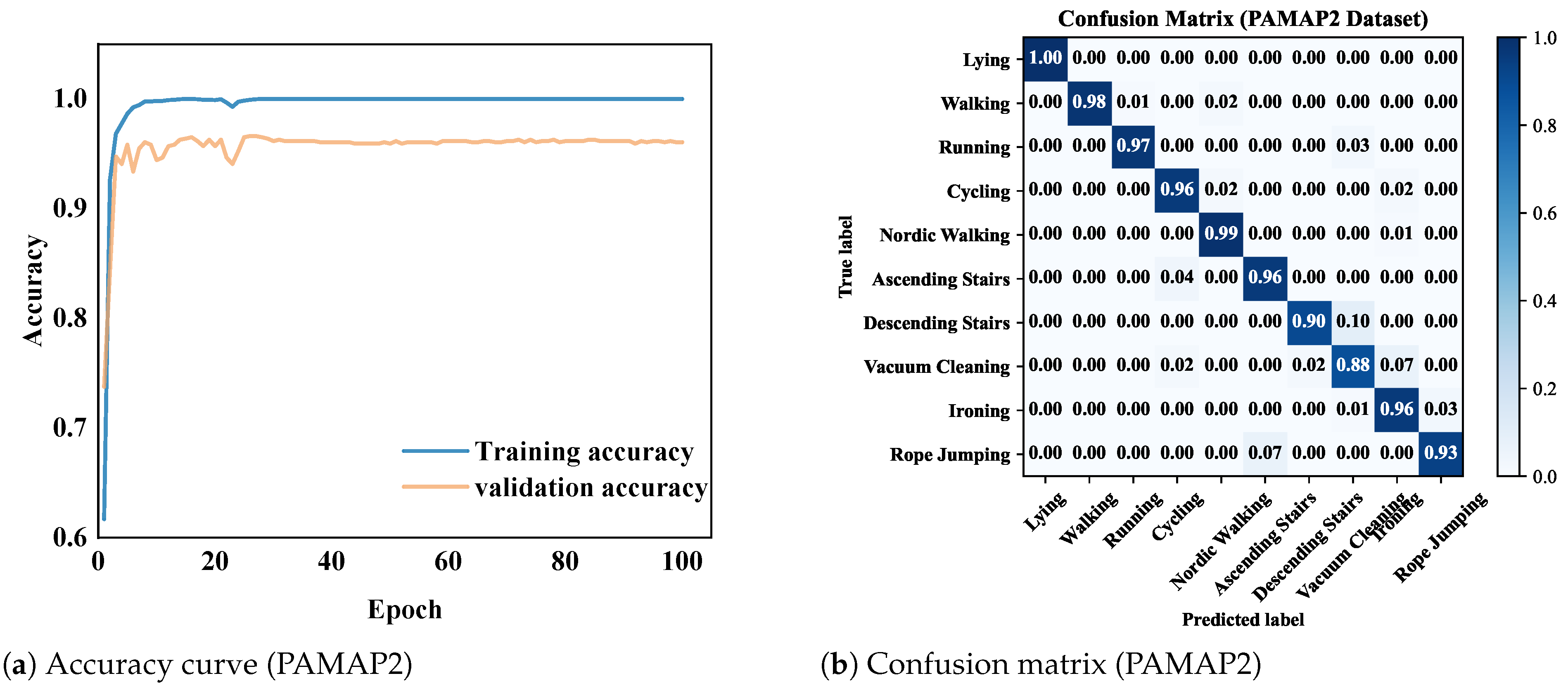 The sensor time series data from all three datasets are segmented using a sliding-window approach. For the WISDM and PAMAP2 datasets, window sizes of 200 and 171 sample points are used, respectively, whereas the UCI-HAR dataset follows its standard protocol with a window size of 128 sample points. A 50% overlap is applied across all datasets to improve data utilization and preserve temporal continuity at window boundaries. After segmentation, the samples are divided into training, validation, and test sets according to a 7:2:1 ratio. Specifically, the WISDM dataset yields 10,709 samples (7496 training, 2142 validation, 1071 testing), the PAMAP2 dataset yields 6038 samples (4227 training, 1207 validation, 604 testing), and the UCI-HAR dataset yields 10,299 samples (7209 training, 2060 validation, 1030 testing). The training set is used for model optimization, the validation set for hyperparameter tuning and ablation experiments, and the test set for final model evaluation, ensuring a balanced distribution and sufficient samples for reliable performance assessment.