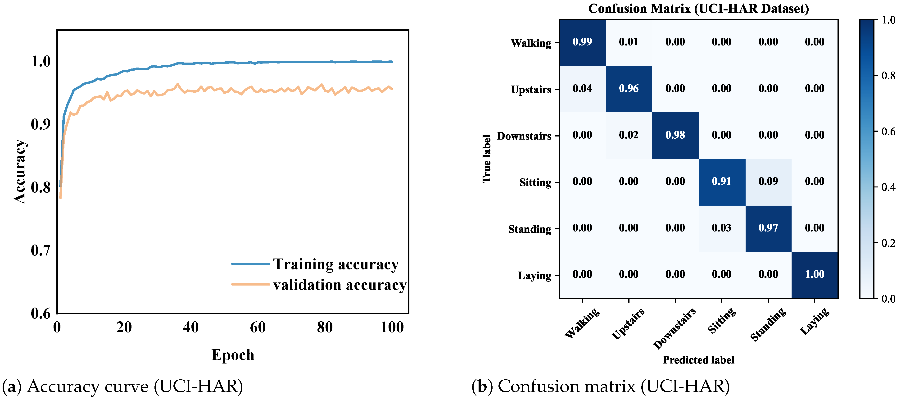 Table 6, the CNN–BiGRU–Transformer model achieves high performance with a relatively small number of trainable parameters and floating-point operations (FLOPs) while maintaining millisecond-level inference times per sample on a PC-grade GPU across the benchmark datasets. These results demonstrate the high computational efficiency of the model and suggest that it has promising potential for real-time human activity recognition in practical applications.