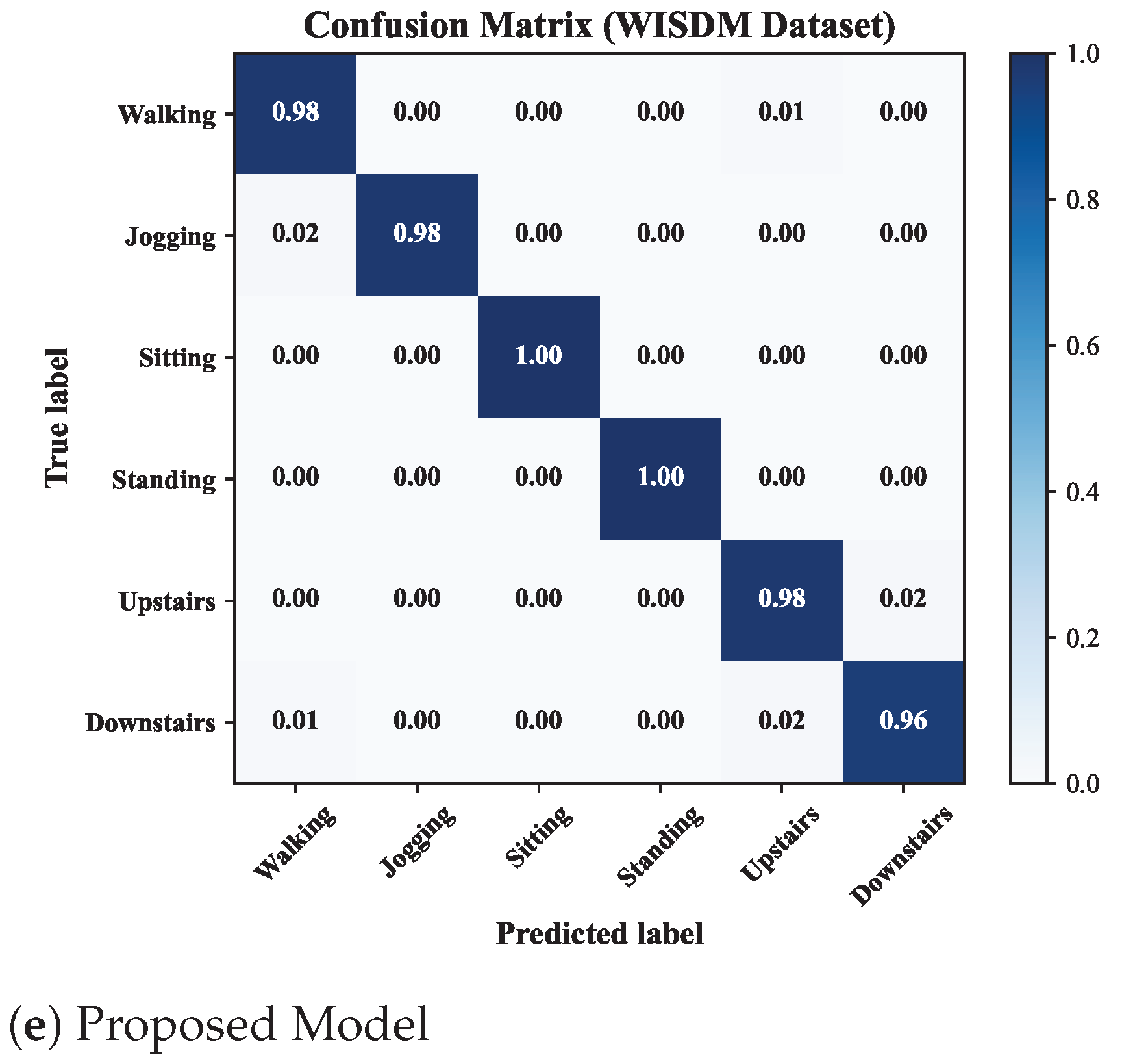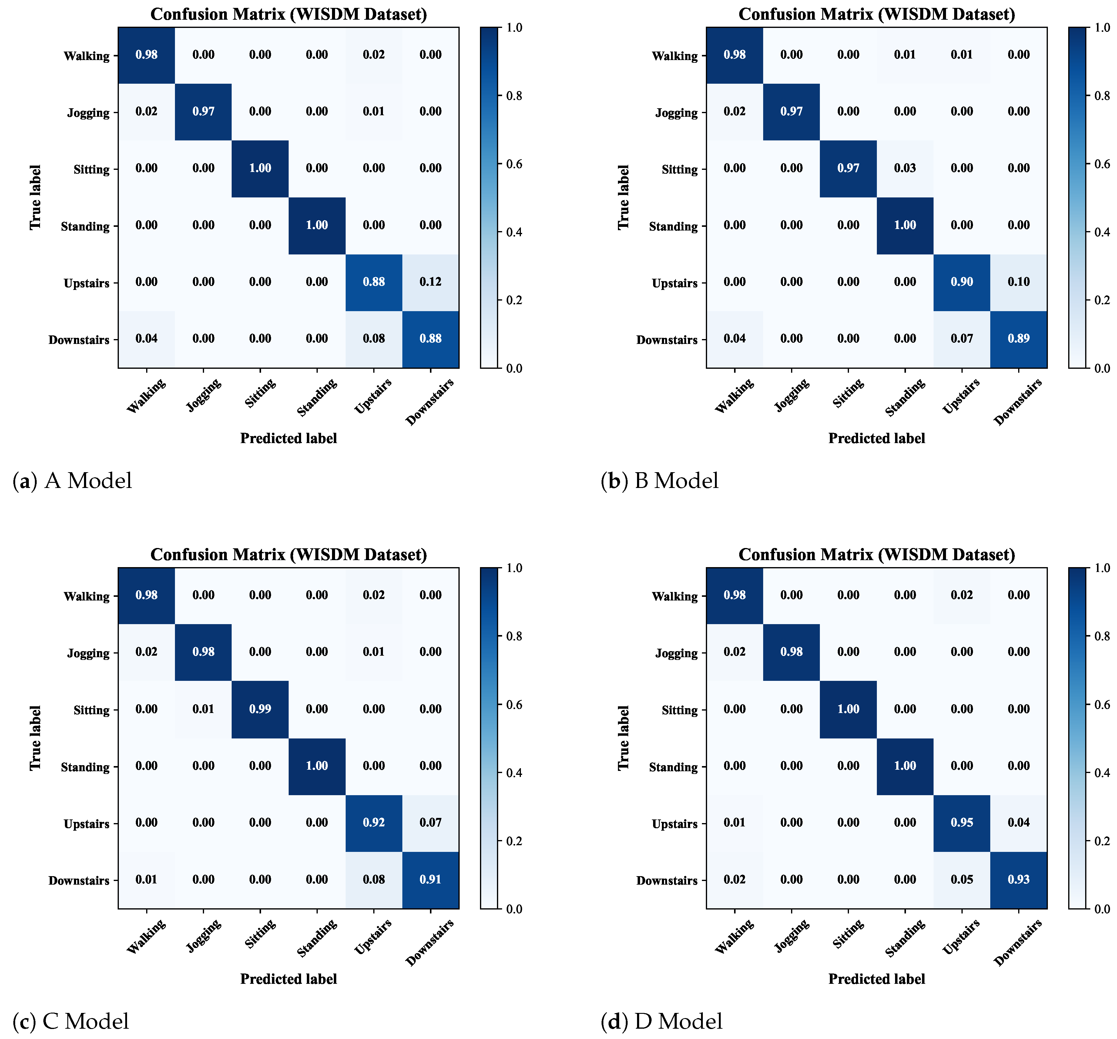 Figure 12. Model A performs reasonably well in static activities such as sitting and standing but exhibits significant confusion in dynamic activities such as upstairs and downstairs, with an accuracy of only 88%. After introducing the BiGRU module, Model B improves the recognition accuracy for upstairs and downstairs activities to 90% and 89%, respectively, demonstrating enhanced capability in modeling local temporal dependencies. Model C, which incorporates the Transformer to capture global temporal dependencies, further improves the recognition accuracy for upstairs and downstairs to 92% and 91%, respectively. Model D, which combines both the BiGRU and Transformer modules, captures both local and global temporal dependencies, resulting in an even higher accuracy for upstairs and downstairs activities at 95% and 93%, respectively. Finally, our proposed model, which incorporates attention into the outputs of the BiGRU and Transformer, achieves the best overall performance, with accuracies reaching 98% for upstairs and 96% for downstairs, demonstrating the effectiveness of attention in enhancing both spatial–temporal feature representation and classification robustness.