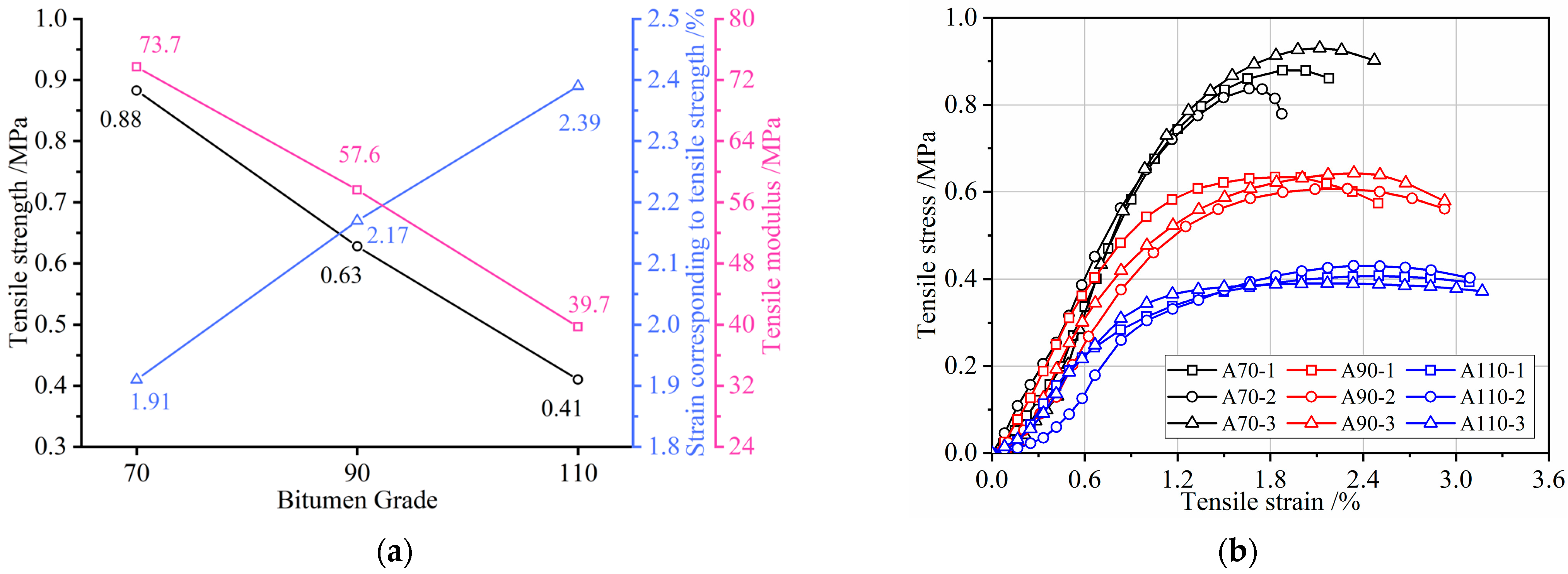 Figure 2. Tensile test results for asphalt concrete of different bitumen grades. (a) Tensile test results vary with bitumen grade; (b) tensile stress–strain curve.