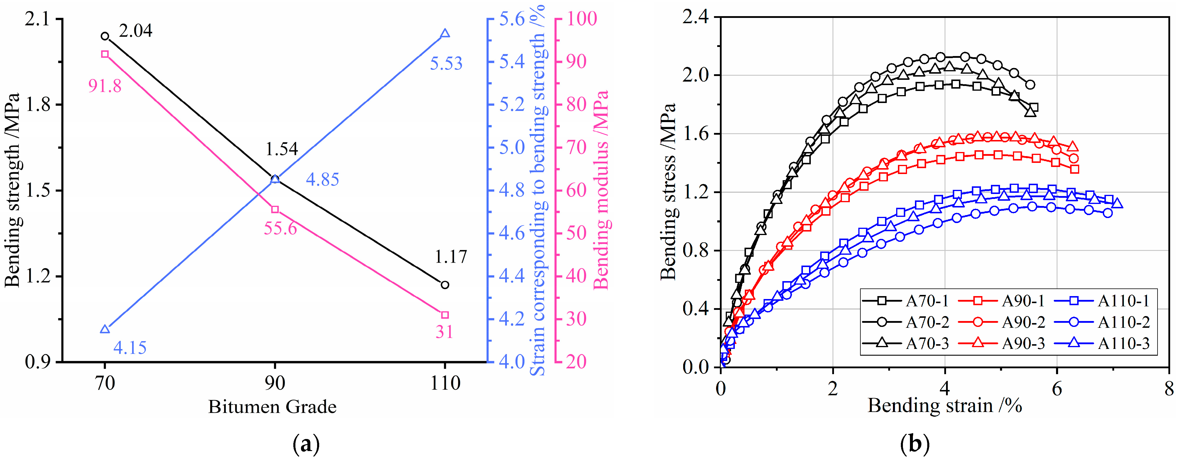 Figure 4. Bending test results for asphalt concrete of different bitumen grades. (a) Bending test results vary with bitumen grade; (b) bending stress–strain curve.