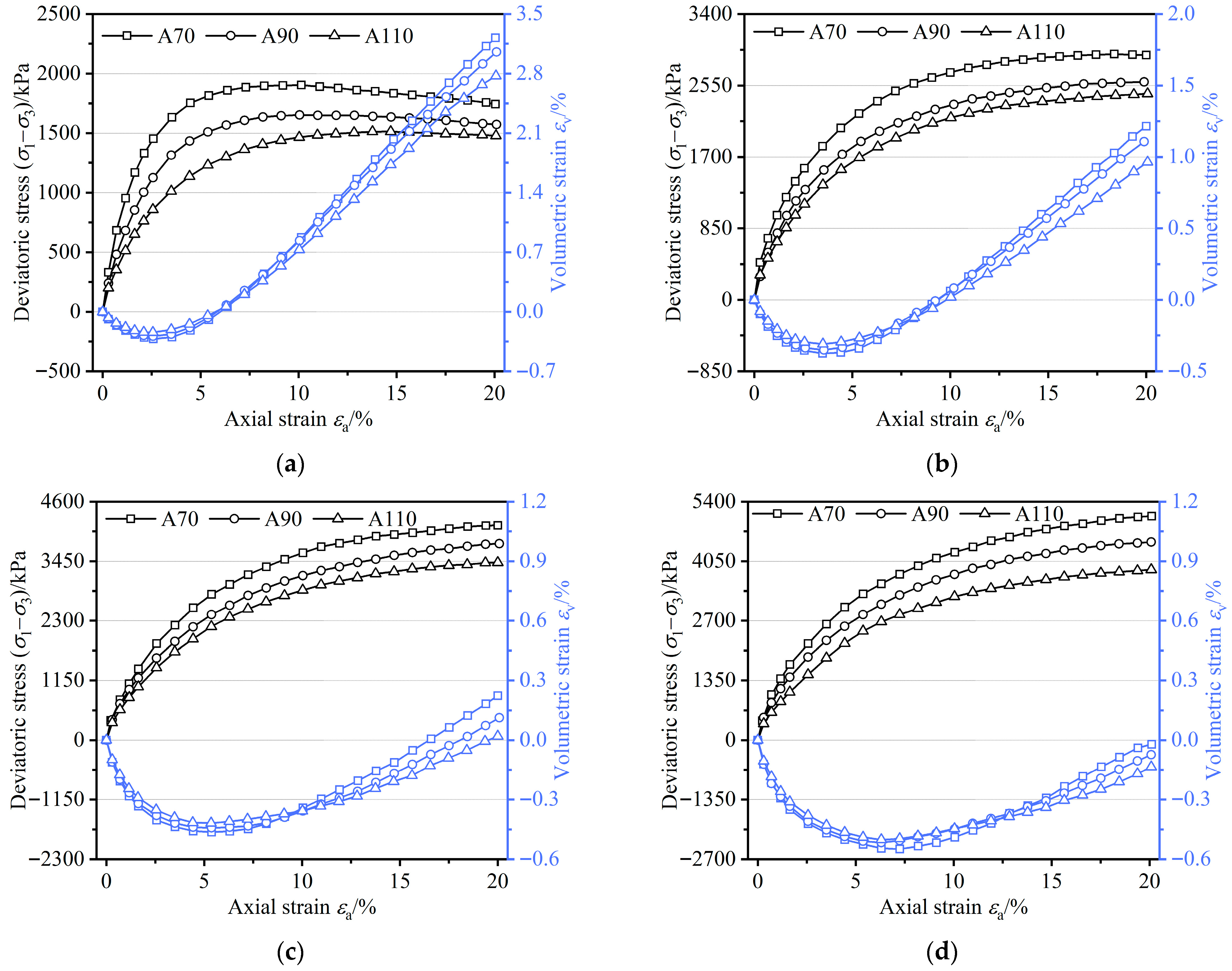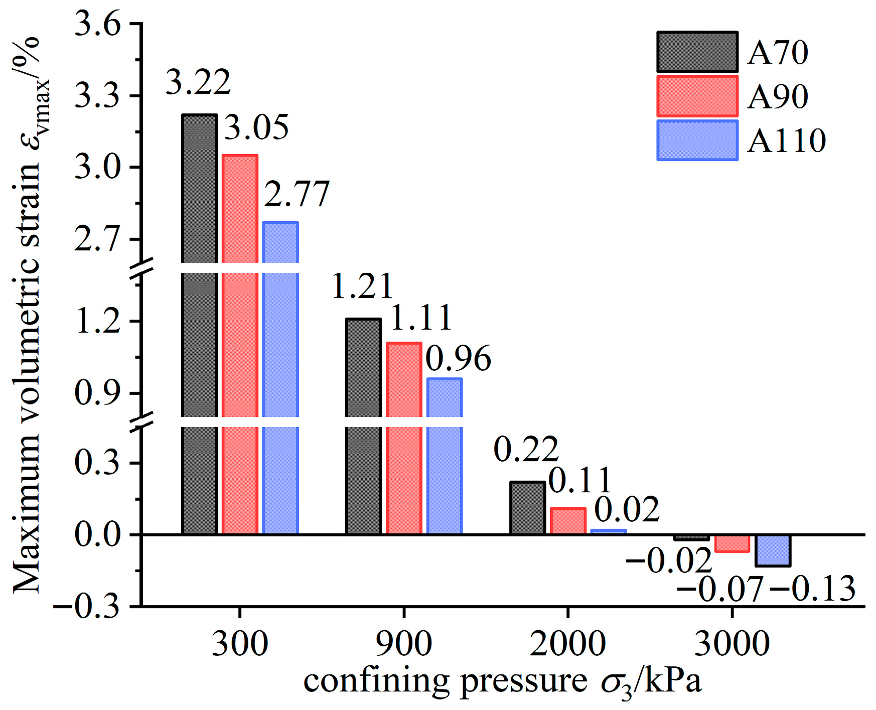 The shear strength and shear deformation behavior of asphalt concrete with different bitumen grades under triaxial compression were investigated through triaxial compression tests. Negative volumetric strain indicates volume contraction of the asphalt concrete. Positive volumetric strain indicates volume expansion of the asphalt concrete. Typical test results were analyzed. Figure 5 presents the deviatoric stress and volumetric strain curves for asphalt concrete of different bitumen grades under confining pressures of 300, 900, 2000, and 3000 kPa. As shown in Figure 4, with increasing bitumen grade, the maximum deviatoric stress of asphalt concrete gradually decreased, while the axial strain corresponding to the maximum deviatoric stress gradually increased. For example, under 300 kPa confining pressure, when the bitumen grade changed from A70 to A110, the maximum deviatoric stress (failure shear stress) of the asphalt concrete decreased from 1903 kPa to 1513 kPa, representing a 20.5% reduction, as shown in Figure 6. The axial strain corresponding to the maximum deviatoric stress increased from 10.1% to 14.7%, reflecting a 39.6% increase. The type of deviatoric stress–strain curve is significantly influenced by bitumen grade. As the bitumen grade increases, the deviatoric stress–strain curve of asphalt concrete transitions from a strain-softening curve to a strain-hardening curve. For example, under the test confining pressure, the deviatoric stress curves of asphalt concrete with bitumen grade of A110 showed no distinct peaks and all exhibited strain-hardening behavior. However, at a confining pressure of 300 kPa, the deviatoric stress curves of asphalt concrete with a bitumen grade of A70 displayed a relatively significant peak and exhibited strain-softening behavior. The results above indicate that as the bitumen grade increases, the ductility and shear deformation properties of asphalt concrete improve, but the deviatoric stress at failure decreases.