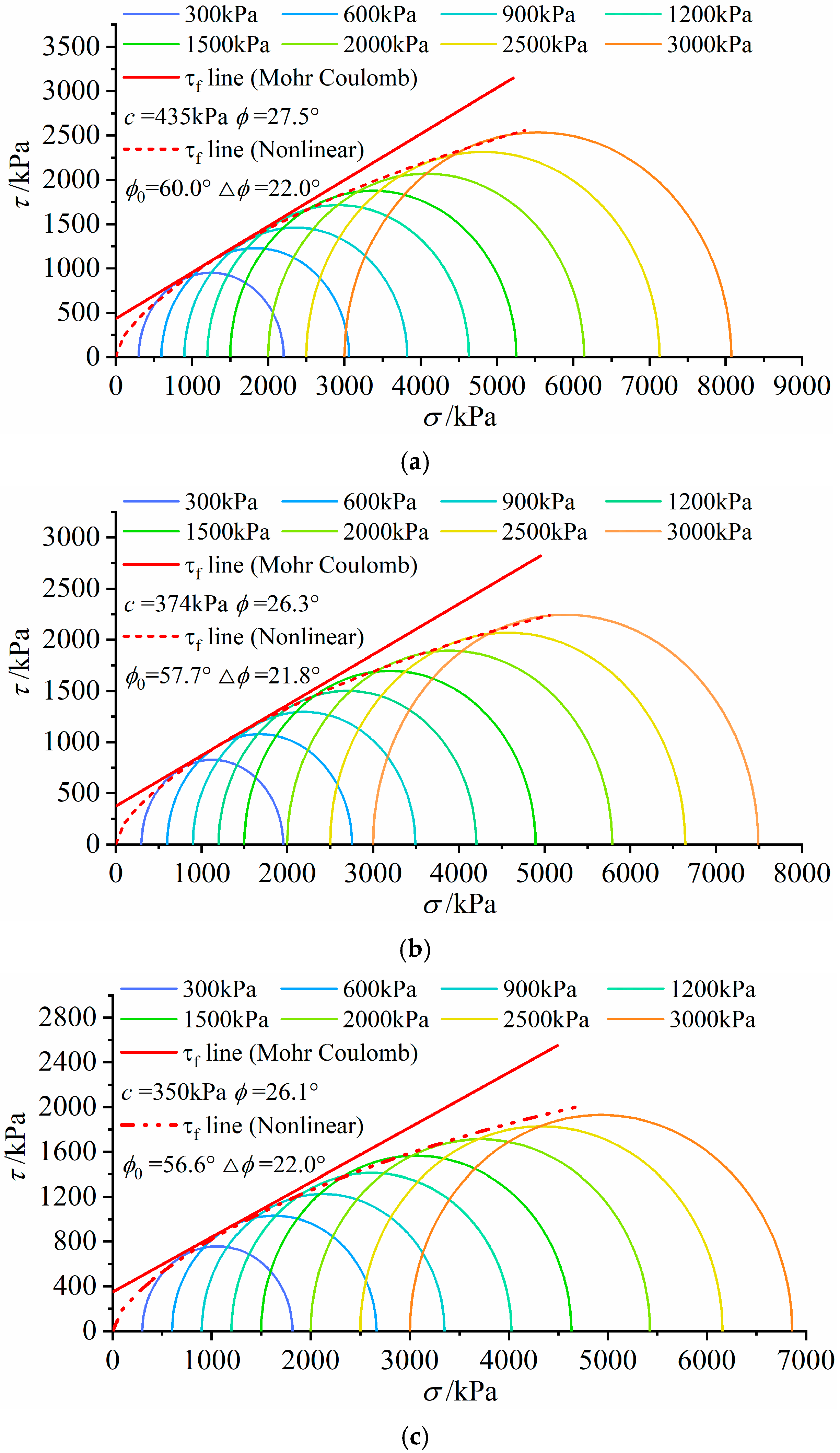 Figure 8. Mohr stress circle and shear strength curve for asphalt concrete with different bitumen grades. (a) Bitumen grade of A70; (b) bitumen grade of A90; and (c) bitumen grade of A110.