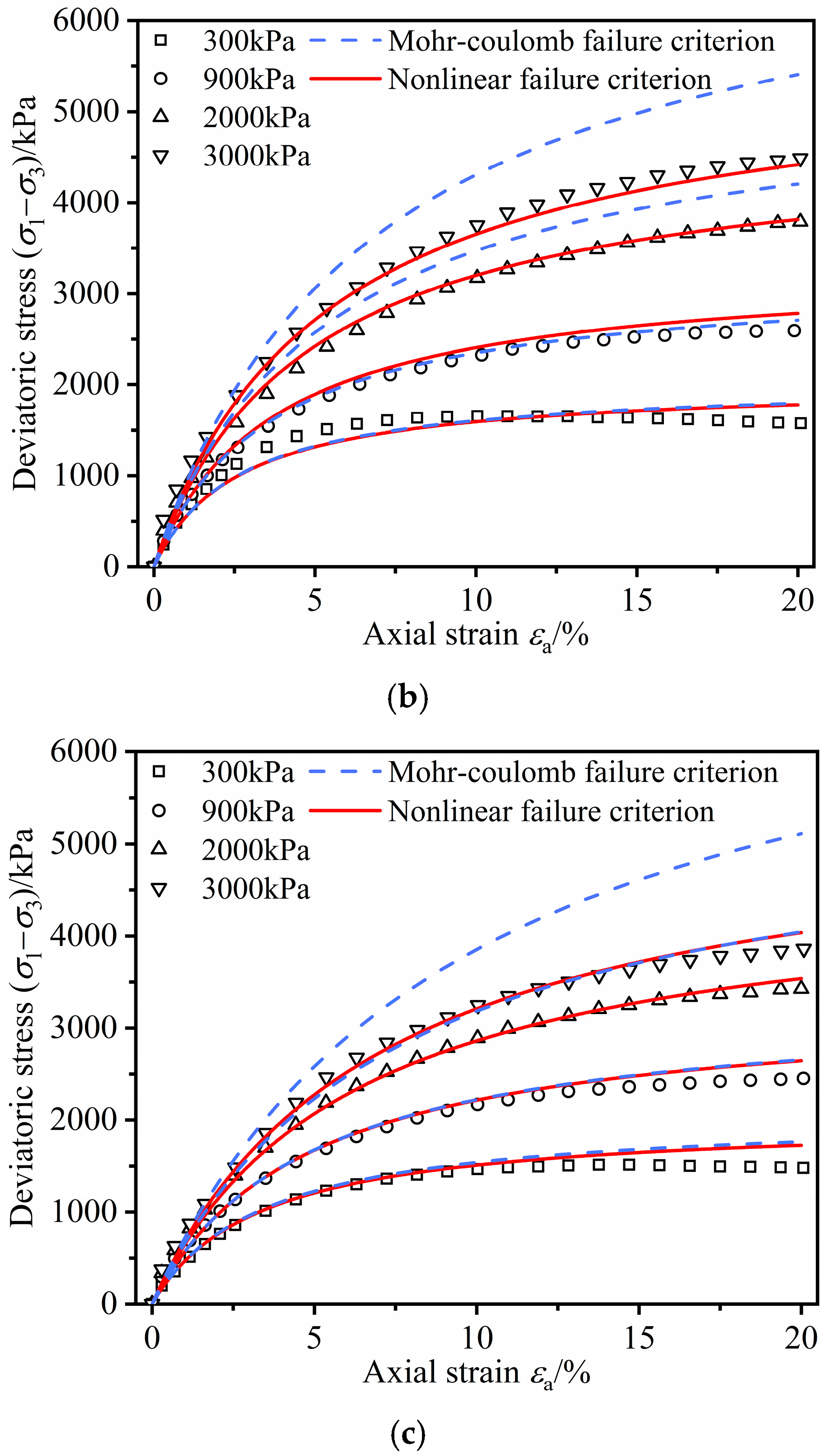 where E t is the elastic modulus, σ 1 is the major principal stress, σ 3 is the confining pressure, σ 1 σ 3 is the deviatoric stress, ε a is the axial strain, R f is the failure ratio, K is the modulus number, and n is the modulus exponent.