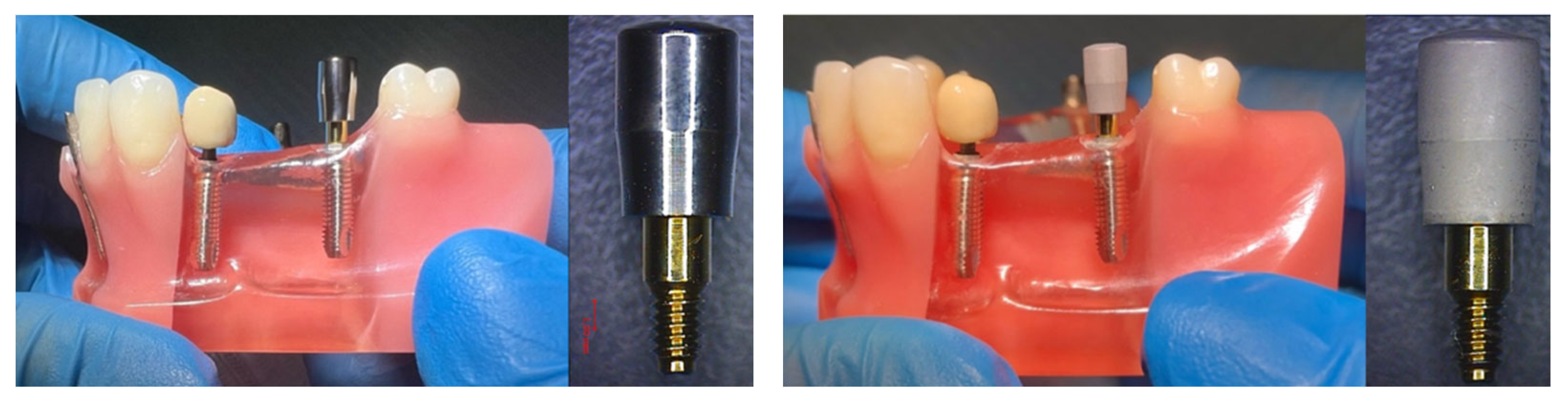 In vitro instrumentation was performed by a single operator using Healing Abutments (HAs) specifically designed for this research, both machined and etched (Megagen, Seoul, Republic of Korea), and applied to a simulation Typodont (Typodont, Kavo Dental, Biberach, Germany) (Figure 1). This simulated the need to work on both healthy implant surfaces and those with tissue loss.