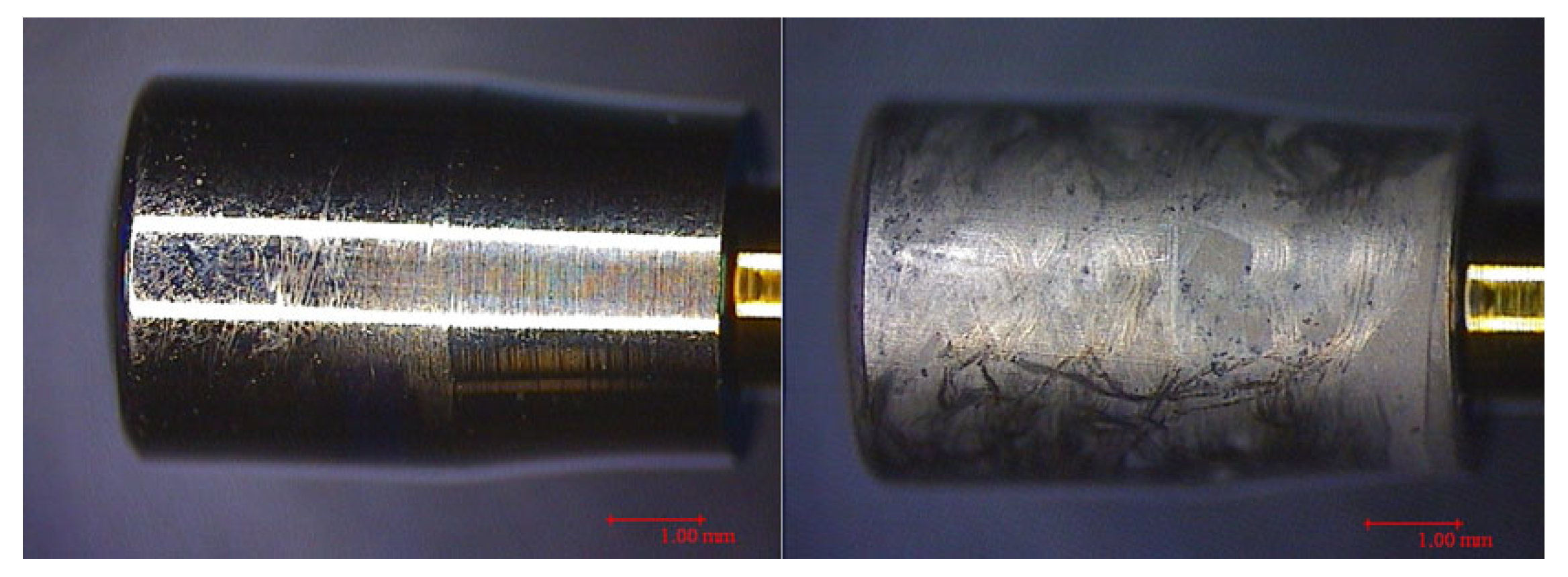 Figure 12. Machined (left) and etched (right) HAs instrumented with Cavitron SofTip.