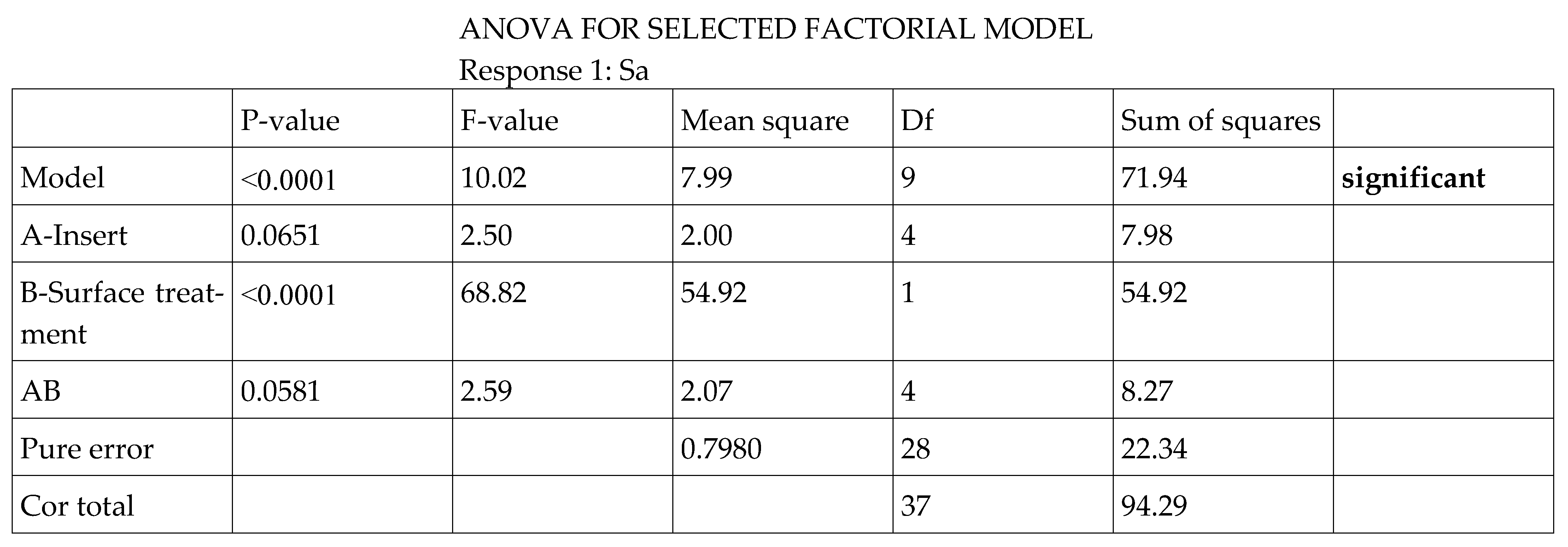 From this two-factor design, it is clear that the treatment factor (B) absorbs the majority of the explained variability; that is, it is the predominant factor in explaining the variability of the objective function under consideration (Sa), followed by the interaction (AB) and finally by the insert factor (A), which therefore present a weak significance compared to the treatment factor.