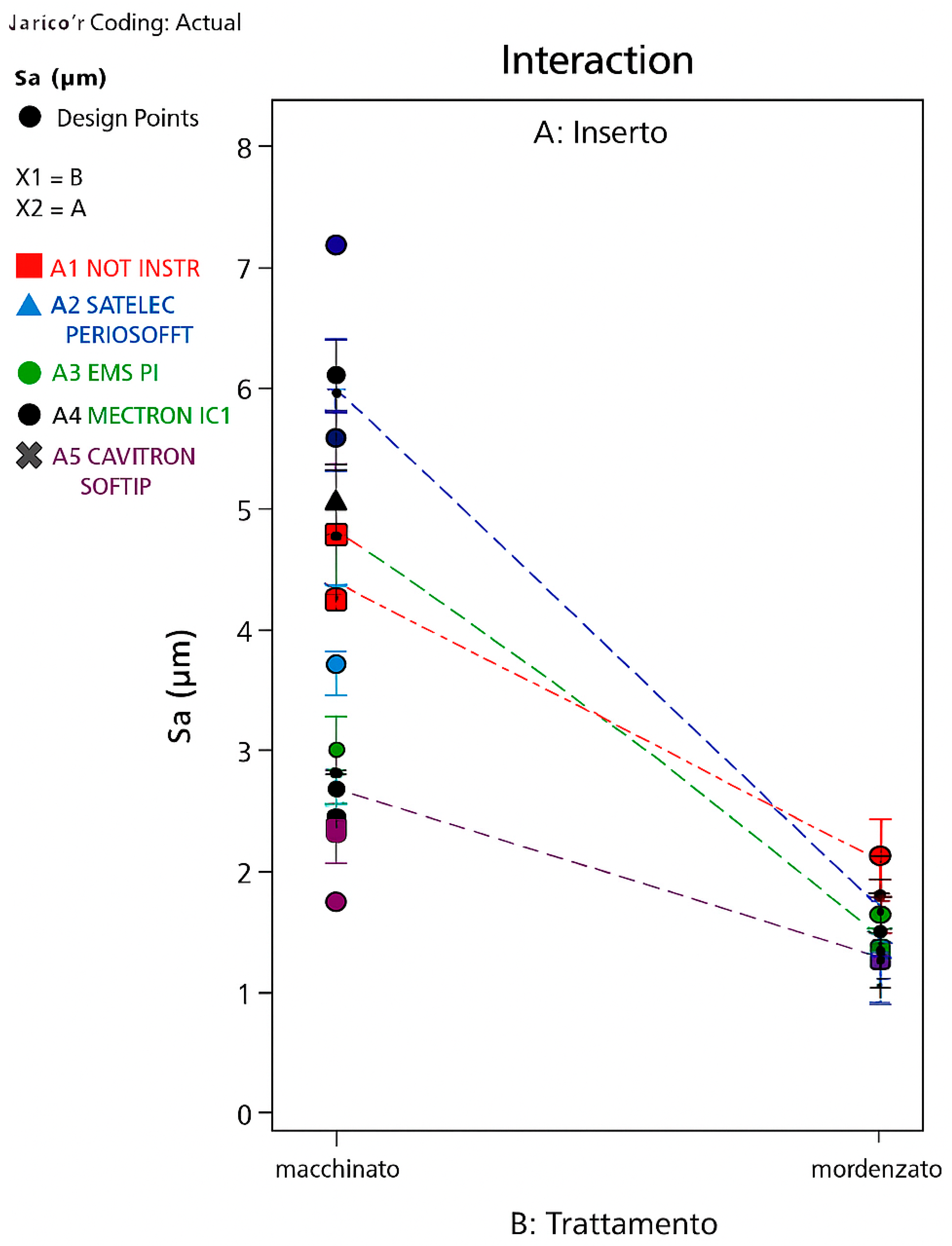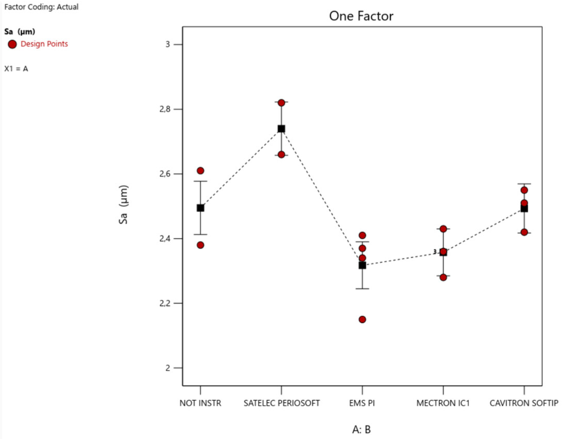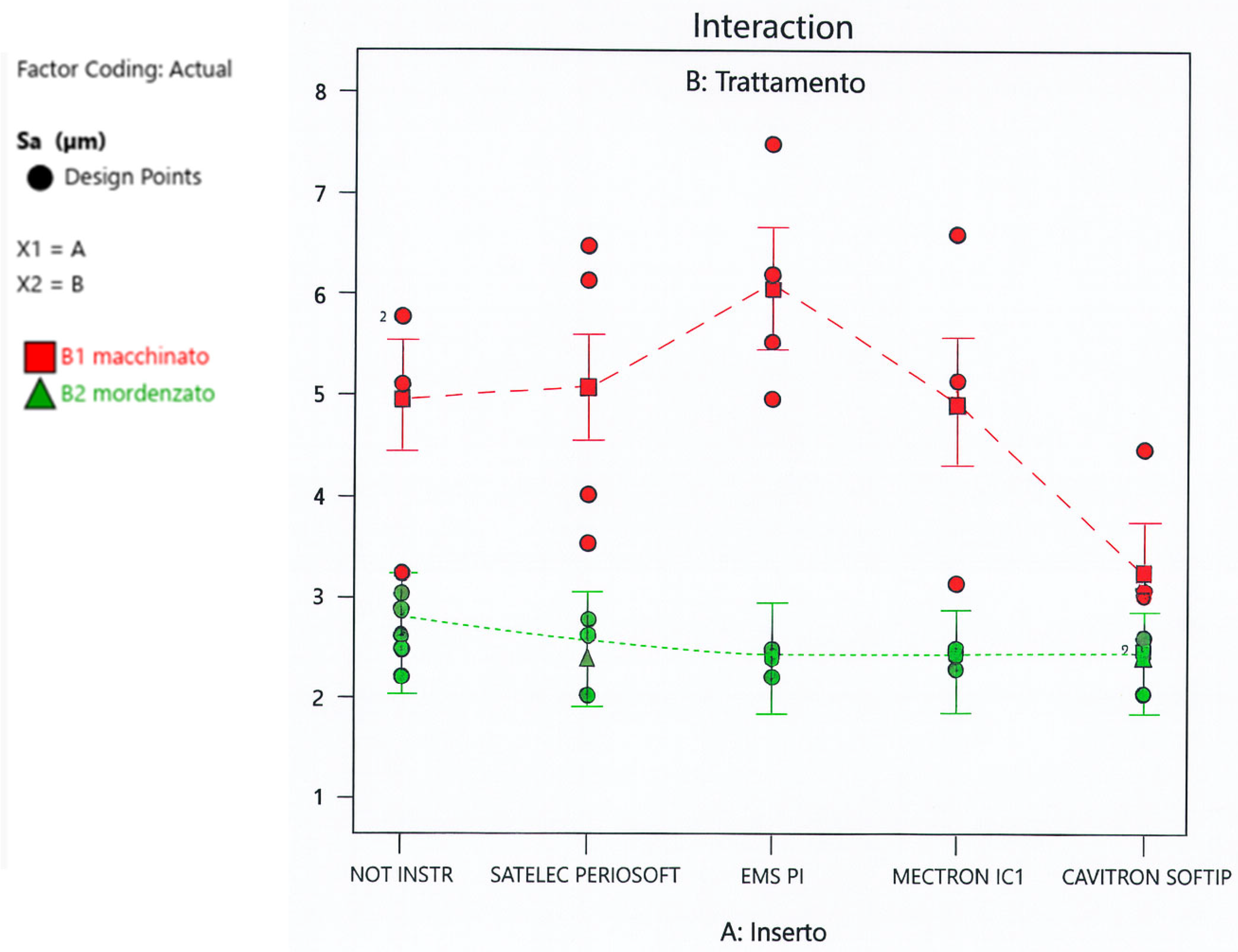 A graph generated by the software (DeltaLog, Genova, Italy) (Figure 14) showing the roughness scale (Sa) on the y-axis and the two levels of the treatment factor on the x-axis shows that the objective function Sa (as is also the case for the Sq parameter) exhibits significantly lower values when switching from machined to etched surface treatment, regardless of whether the HA is instrumented or not and regardless of the insert used for that instrumentation.