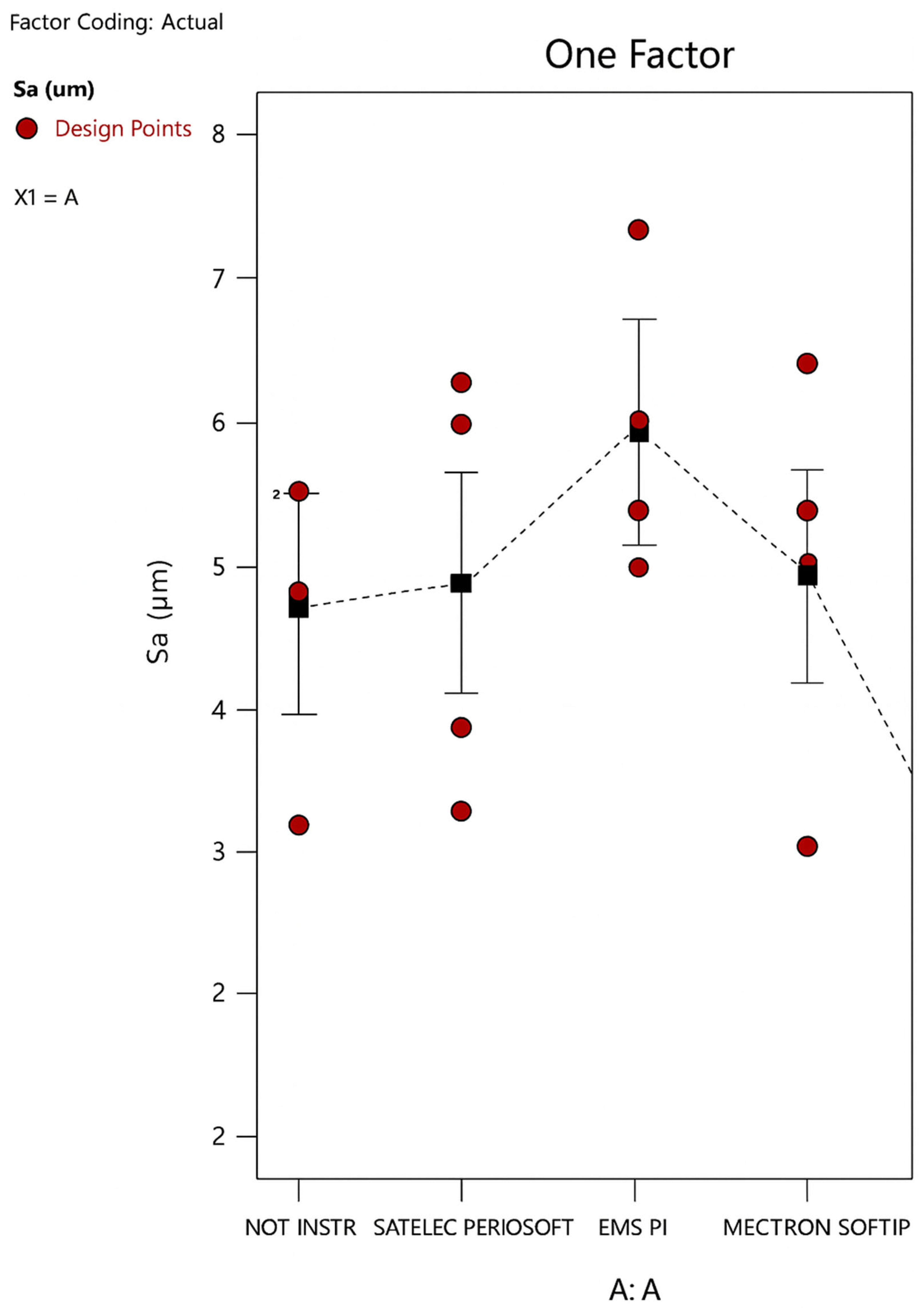 In particular, it can be stated that levels 3 (HA instrumented with an EMS PI insert) and 5 (HA instrumented with a Cavitron sofTip insert) show a statistically significant difference compared to the control level, with an increase (the former) and a decrease (the latter) in the Sa objective function, respectively.