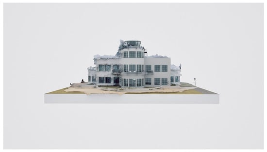 As Remondino and Campana [] pointed out, the quality of three-dimensional models depends greatly on environmental conditions and proper planning and organisation when taking images, so having an unobstructed space helps to obtain better results. Figure 2 shows the control tower and adjacent hangar, contextualizing the structure within its immediate surroundings.