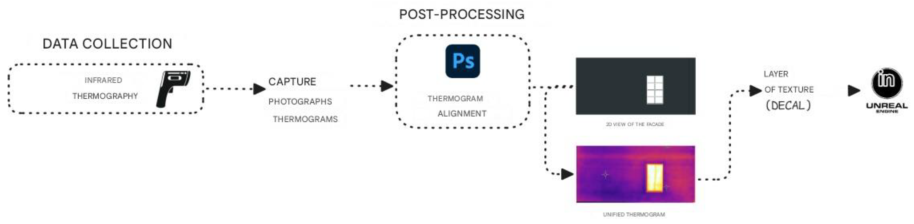 Key methodological advances include: (1) systematic documentation of smartphone-based photogrammetry protocols optimized for architectural-scale reconstruction with emphasis on facade geometry and fenestration systems; (2) standardized procedures for integrating infrared thermographic data as texture layers within BIM environments, preserving spatial registration and thermal metadata; (3) development of interactive visualization frameworks in Unreal Engine that enable intuitive exploration of multi-layered building performance data without requiring specialized training; and (4) establishment of quality control criteria for validating geometric accuracy, thermal data fidelity, and visual representation consistency throughout the workflow.