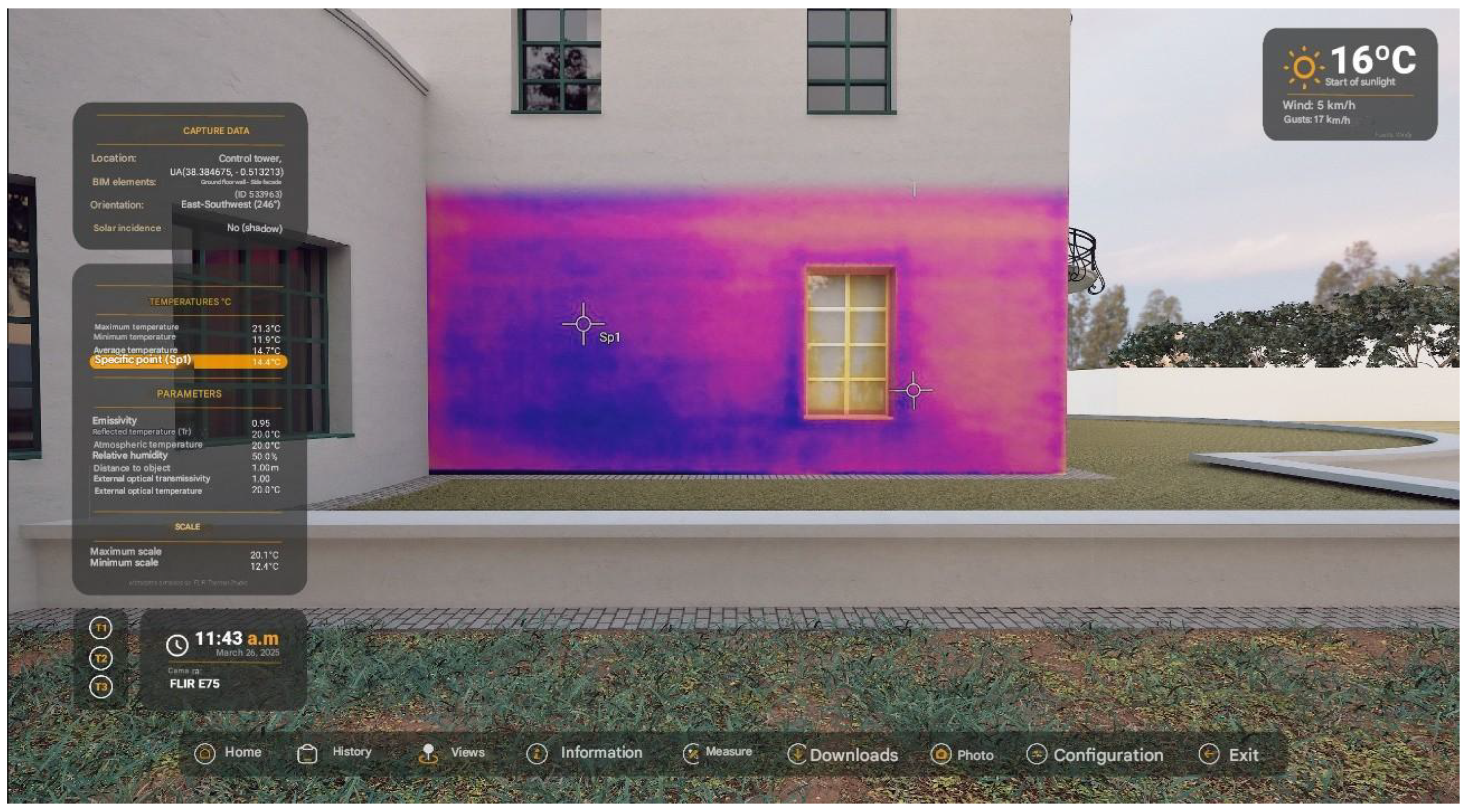Time Investment Breakdown: The complete workflow execution required a cumulative 22 h of labor distributed across four phases: (1) fieldwork planning and site reconnaissance (2 h), (2) photographic and thermographic data capture (6 h), (3) photogrammetric processing and point cloud generation (7 h), (4) BIM modeling and thermal data integration (4 h), and (5) Unreal Engine environment configuration and interactivity scripting (3 h). Notably, processing tasks (phases 3–5) can be executed asynchronously during non-business hours, reducing effective project timeline impact to approximately 10 working hours of active supervision.