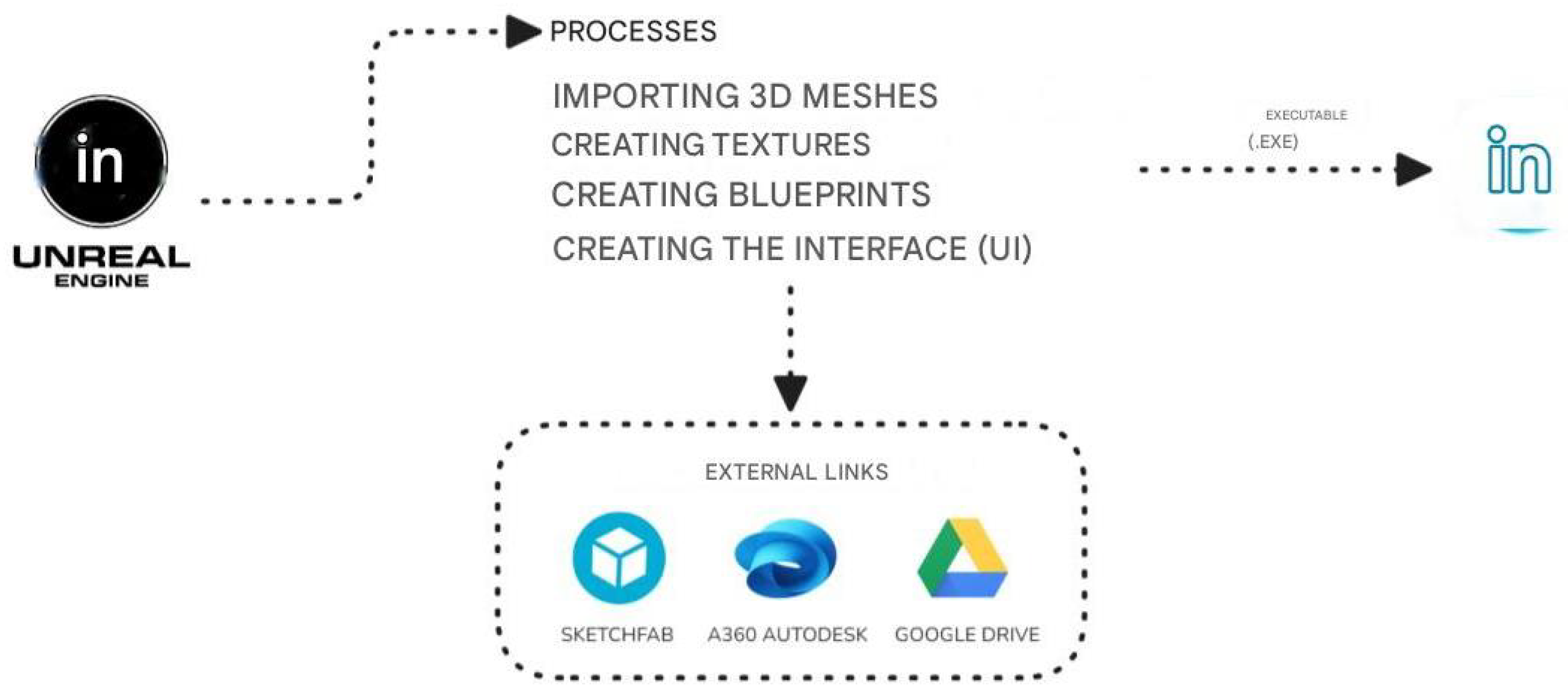Integration and final visualisation in Unreal Engine, through an interactive environment that allows navigation through layers (photogrammetry, 3D model and thermography), as well as access to download links for the generated material.