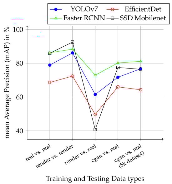The graphs presented in Figure 4 and Figure 5 show the results of evaluation of the datasets. On the x-axis, we have different training and testing data types based on the domain of the dataset. The OD models were trained on real images, rendered images, and CycleGAN-generated images trained with 400 and 5000 images (as shown in Figure 2a–d), and tested on real camera-captured images. We also included results from an OD model trained and tested on rendered images to assess performance on this data type. The y-axis represents the mAP at 0.5–0.95 IoU, shown as a percentage.