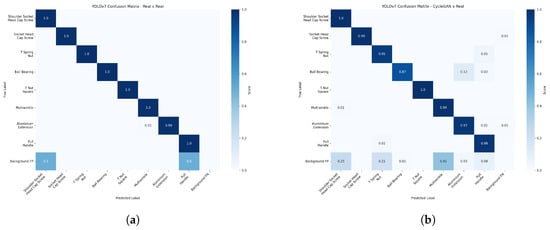 Recent advances in the field emphasize that achieving high mAP scores—typically higher than 90%—is vital for reliable manufacturing quality inspection [,], where both high precision and recall are crucial, as even minimal classification errors can result in defective products or costly recalls. In our implementation, the highest performance was observed with the YOLOv7 model trained on 400 real camera images, achieving a mAP of 98.3%. When trained on our synthetic dataset of the same size, the model achieved a mAP of 90.4%. This level of accuracy is particularly important in industrial settings, such as automated visual inspection of components, where strict quality standards and low defect tolerance are mandatory. Figure 6a,b show the confusion matrices of the YOLOv7 model trained on real images and CycleGAN-generated images, respectively, with both models evaluated on real camera images. As observed, the number of false negatives increases when the model is trained on generated images compared to training on real images. The most notable differences arise from the background false negative and false positive classes, indicating that the model frequently fails to detect certain objects and also incorrectly classifies background regions as objects, respectively. The ongoing work focuses on identifying the root causes of these errors and mitigating them to enhance the realism and diversity of synthetic data, with the goal of narrowing the 7.9% performance gap between models trained on real versus synthetic datasets.