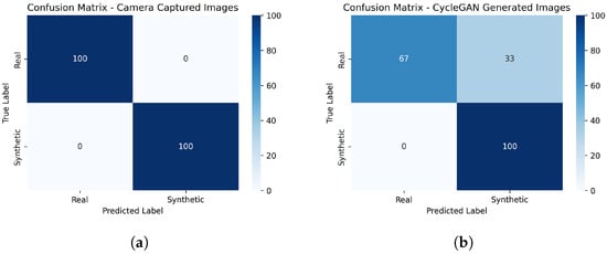 Confusion Matrix for Classification on (a) Camera-captured Images versus Rendered images (b) CycleGAN-Generated Images versus Rendered images.
