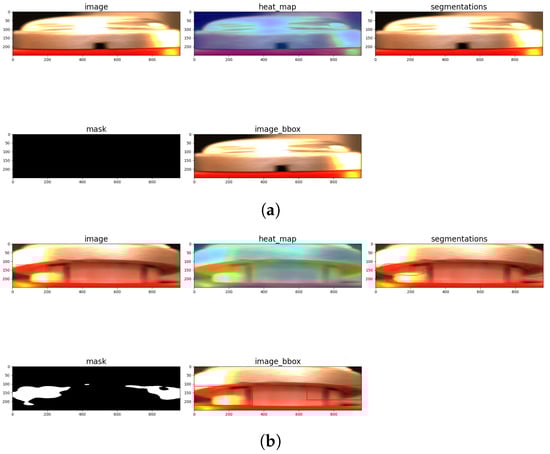 The results produced by the Reverse Distillation AD model are presented in Figure 12a,b. In Figure 12a, no anomalies are detected, as the temperature sensor is correctly mounted on the casing cylinder. This is reflected in the segmentation map and masks, which indicate a normal condition. In contrast, Figure 12b illustrates the scenario in which the temperature sensor is improperly mounted on the casing cylinder. In this case, the model successfully identifies the anomaly, generating segmentation maps, masks, and bounding boxes that highlight the defective region, as shown in Figure 12b.