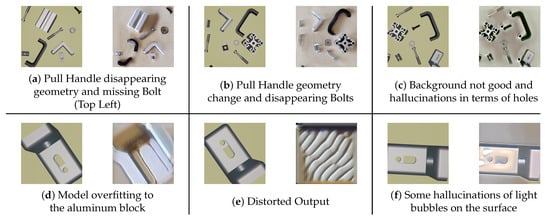 A key drawback of the proposed pipeline is its dependence on generative models such as CycleGAN for domain adaptation. Achieving high-quality results with these models requires precise tuning of hyperparameters and careful selection of the number of training epochs to prevent both overfitting and underfitting. As illustrated in Figure 13, several types of errors were observed during domain transfer involving similar and different objects. In the case of similar objects, overfitting frequently led to issues such as objects blending into the background or completely disappearing, as shown in Figure 13a,b. Distortions in object geometry (Figure 13b) and hallucinated features such as holes (Figure 13c) were also observed. When domains were transferred between different objects, overfitting became even more pronounced, leading to severe artifacts, as seen in Figure 13d,e. Additional anomalies such as inconsistent color tones or the appearance of white bubbles were also evident, particularly in Figure 13f.